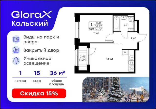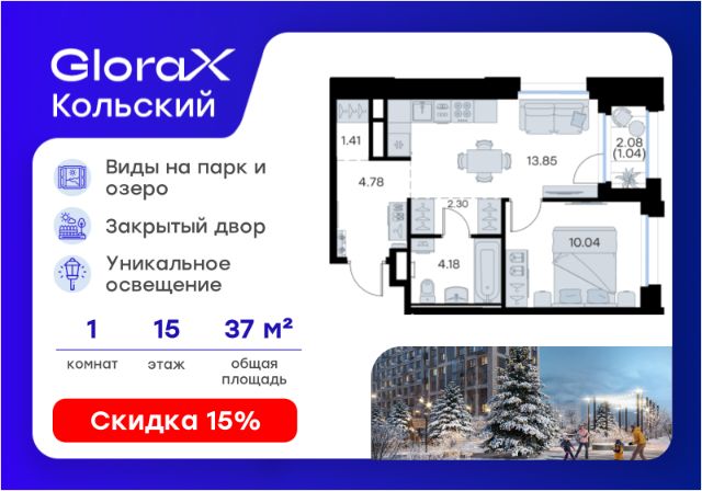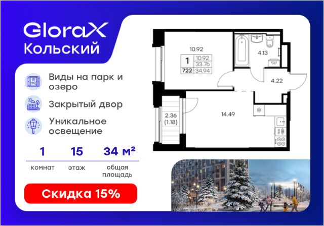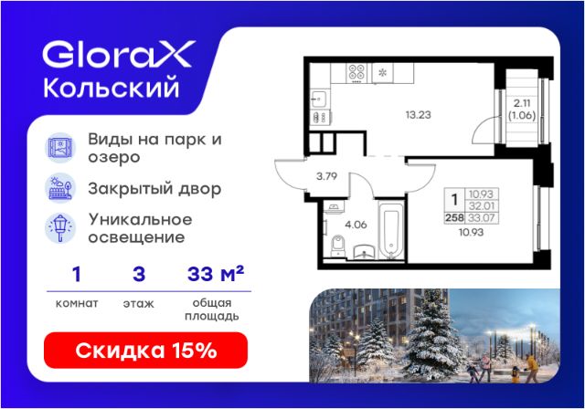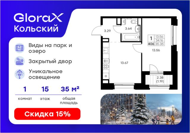 Продается 1-комн. квартира на 14-м этаже в проекте бизнес-класса GloraX Кольский. Общая площадь лота составляет 34,94 кв. м, из которых 10,92 кв. м отведено под жилую и 14,49 кв. м под кухонную зону. Номер квартиры - 713. Преимущества квартиры: компактная евро-2; лоджия. - Масштабный проект комфорт-класса в зеленой локации - Лаконичная современная архитектура - Закрытая территория с видеонаблюдением - Квартиры с евро-планировками - Система "Умный дом" - IP-видеонаблюдение, free Wi-fi на территории - Детские разновозрастные площадки - Парк и озеро рядом с домом - Комьюнити-центр для жильцов GloraX Кольский — новая точка притяжения на карте Мурманска. Проект, который рожден на границе городского и природного, современного и вечного, уюта и великой северной силы. Мы создаем совершенно новое пространство для жизни: с видом на Варничное озеро, вблизи Долины Уюта, среди ландшафтов, в которых слышен голос Севера. Отсюда всего 10 минут на транспорте до центра города. Рядом — школы и детские сады, поликлиника, фитнес-центры и торговые комплексы. Поблизости — крупнейшие спортивные объекты Мурманска: легкоатлетический манеж, ледовая арена, горнолыжный склон и маршруты для скандинавской ходьбы. Мы проектировали дома, опираясь не только на эстетику, но и на климат, свет, направление ветра и рельеф. Это архитектура, которая не спорит с ландшафтом, а продолжает его сдержанно, точно и со вкусом. Фасады лаконичны, но выразительны. Материалы выбраны с учетом суровых условий Заполярья: устойчивые к ветру, снегу, перепадам температур. Но при всей практичности они не теряют визуальной легкости. Дом здесь словно вписан в северную линию горизонта — сдержанную, но бесконечно живую. Концепция благоустройства построена на идее "светового компаса": динамичная подсветка реагирует на смену суток и сезонов. Утром она бодрит, вечером — успокаивает, зимой создает акценты, имитируя северное сияние. Функциональность поддержана геопластикой: детские и спортивные площадки расположены на разных уровнях, словно террасы, спускающиеся к парку. Каждая из них спроектирована с учетом возраста, сценария и рельефа. Здесь есть зоны для малышей, подростков, воркаут-комплексы, настольный теннис, места для йоги и тихого отдыха. А в зимние месяцы склоны превращаются в естественные тюбинговые трассы. Но главное — парк. Долина Уюта — это не "рекреационная зона рядом". Это часть жизни, открытая с утра до вечера. Здесь бегают, выгуливают собак, катаются на лыжах и устраивают праздники. Проект вобрал лучшее из многолетнего опыта компании GloraX: лаконичная современная архитектура, закрытые дворы, продуманные сценарии освещения, вдохновленные полярными сутками, экологичный ландшафт и умный подход к комфорту. GloraX Кольский — для тех, кто влюблен в Север. И для тех, кто готов в него влюбиться. Цена указана при 100% оплате или стандартной ипотеке. Узнайте подробности в Отделе продаж.