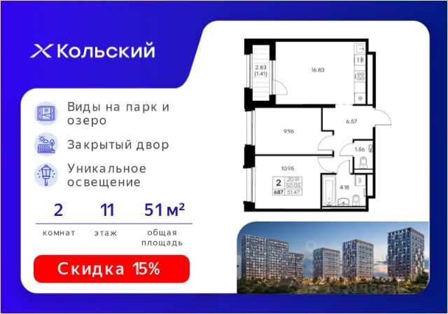 Продается 2-комн. квартира на 11-м этаже в проекте комфорт-класса Кольский. Общая площадь лота составляет 50,29 кв. м, из которых 21,58 кв. м отведено под жилую и 17,31 кв. м под кухонную зону. Номер квартиры - 119. Преимущества квартиры: компактная евро-3, угловая; вид на озеро. - Масштабный проект комфорт-класса в зеленой локации - Лаконичная современная архитектура - Закрытая территория с видеонаблюдением - Квартиры с евро-планировками - Система "Умный дом" - IP-видеонаблюдение, free Wi-fi на территории - Детские разновозрастные площадки - Парк и озеро рядом с домом - Комьюнити-центр для жильцов Кольский — новая точка притяжения на карте Мурманска. Проект, который рожден на границе городского и природного, современного и вечного, уюта и великой северной силы. Мы создаем совершенно новое пространство для жизни: с видом на Варничное озеро, вблизи Долины Уюта, среди ландшафтов, в которых слышен голос Севера. Отсюда всего 10 минут на транспорте до центра города. Рядом — школы и детские сады, поликлиника, фитнес-центры и торговые комплексы. Поблизости — крупнейшие спортивные объекты Мурманска: легкоатлетический манеж, ледовая арена, горнолыжный склон и маршруты для скандинавской ходьбы. Мы проектировали дома, опираясь не только на эстетику, но и на климат, свет, направление ветра и рельеф. Это архитектура, которая не спорит с ландшафтом, а продолжает его сдержанно, точно и со вкусом. Фасады лаконичны, но выразительны. Материалы выбраны с учетом суровых условий Заполярья: устойчивые к ветру, снегу, перепадам температур. Но при всей практичности они не теряют визуальной легкости. Дом здесь словно вписан в северную линию горизонта — сдержанную, но бесконечно живую. Концепция благоустройства построена на идее "светового компаса": динамичная подсветка реагирует на смену суток и сезонов. Утром она бодрит, вечером — успокаивает, зимой создает акценты, имитируя северное сияние. Функциональность поддержана геопластикой: детские и спортивные площадки расположены на разных уровнях, словно террасы, спускающиеся к парку. Каждая из них спроектирована с учетом возраста, сценария и рельефа. Здесь есть зоны для малышей, подростков, воркаут-комплексы, настольный теннис, места для йоги и тихого отдыха. А в зимние месяцы склоны превращаются в естественные тюбинговые трассы. Но главное — парк. Долина Уюта — это не "рекреационная зона рядом". Это часть жизни, открытая с утра до вечера. Здесь бегают, выгуливают собак, катаются на лыжах и устраивают праздники. Проект вобрал лучшее из многолетнего опыта компании GloraX: лаконичная современная архитектура, закрытые дворы, продуманные сценарии освещения, вдохновленные полярными сутками, экологичный ландшафт и умный подход к комфорту. Кольский — для тех, кто влюблен в Север. И для тех, кто готов в него влюбиться. Цена указана при 100% оплате или стандартной ипотеке. Узнайте подробности в Отделе продаж. Купить 2-комнатную квартиру площадью примерно 50 м2 (кв.м.) в Мурманской области.