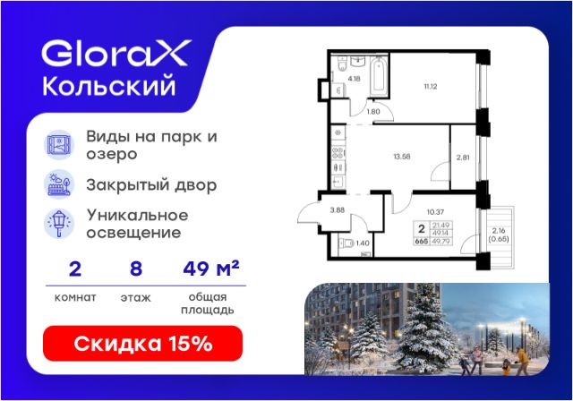 Продается 2-комн. квартира на 2-м этаже в проекте бизнес-класса GloraX Кольский. Общая площадь лота составляет 49,14 кв. м, из которых 21,49 кв. м отведено под жилую и 13,58 кв. м под кухонную зону. Номер квартиры - 611. Преимущества квартиры: компактная евро-3; зимний сад; мастер-спальня. - Масштабный проект комфорт-класса в зеленой локации - Лаконичная современная архитектура - Закрытая территория с видеонаблюдением - Квартиры с евро-планировками - Система "Умный дом" - IP-видеонаблюдение, free Wi-fi на территории - Детские разновозрастные площадки - Парк и озеро рядом с домом - Комьюнити-центр для жильцов GloraX Кольский — новая точка притяжения на карте Мурманска. Проект, который рожден на границе городского и природного, современного и вечного, уюта и великой северной силы. Мы создаем совершенно новое пространство для жизни: с видом на Варничное озеро, вблизи Долины Уюта, среди ландшафтов, в которых слышен голос Севера. Отсюда всего 10 минут на транспорте до центра города. Рядом — школы и детские сады, поликлиника, фитнес-центры и торговые комплексы. Поблизости — крупнейшие спортивные объекты Мурманска: легкоатлетический манеж, ледовая арена, горнолыжный склон и маршруты для скандинавской ходьбы. Мы проектировали дома, опираясь не только на эстетику, но и на климат, свет, направление ветра и рельеф. Это архитектура, которая не спорит с ландшафтом, а продолжает его сдержанно, точно и со вкусом. Фасады лаконичны, но выразительны. Материалы выбраны с учетом суровых условий Заполярья: устойчивые к ветру, снегу, перепадам температур. Но при всей практичности они не теряют визуальной легкости. Дом здесь словно вписан в северную линию горизонта — сдержанную, но бесконечно живую. Концепция благоустройства построена на идее "светового компаса": динамичная подсветка реагирует на смену суток и сезонов. Утром она бодрит, вечером — успокаивает, зимой создает акценты, имитируя северное сияние. Функциональность поддержана геопластикой: детские и спортивные площадки расположены на разных уровнях, словно террасы, спускающиеся к парку. Каждая из них спроектирована с учетом возраста, сценария и рельефа. Здесь есть зоны для малышей, подростков, воркаут-комплексы, настольный теннис, места для йоги и тихого отдыха. А в зимние месяцы склоны превращаются в естественные тюбинговые трассы. Но главное — парк. Долина Уюта — это не "рекреационная зона рядом". Это часть жизни, открытая с утра до вечера. Здесь бегают, выгуливают собак, катаются на лыжах и устраивают праздники. Проект вобрал лучшее из многолетнего опыта компании GloraX: лаконичная современная архитектура, закрытые дворы, продуманные сценарии освещения, вдохновленные полярными сутками, экологичный ландшафт и умный подход к комфорту. GloraX Кольский — для тех, кто влюблен в Север. И для тех, кто готов в него влюбиться. Цена указана при 100% оплате или стандартной ипотеке. Узнайте подробности в Отделе продаж. Купить 2-комнатную квартиру с двумя санузлами в Мурманске.