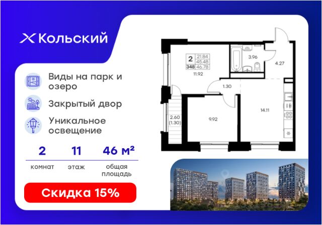 Продается 2-комн. квартира на 11-м этаже в проекте комфорт-класса Кольский. Общая площадь лота составляет 46,78 кв. м, из которых 21,84 кв. м отведено под жилую и 14,11 кв. м под кухонную зону. Номер квартиры - 348. Преимущества квартиры: компактная евро-3, угловая; лоджия. - Масштабный проект комфорт-класса в зеленой локации - Лаконичная современная архитектура - Закрытая территория с видеонаблюдением - Квартиры с евро-планировками - Система "Умный дом" - IP-видеонаблюдение, free Wi-fi на территории - Детские разновозрастные площадки - Парк и озеро рядом с домом - Комьюнити-центр для жильцов Кольский — новая точка притяжения на карте Мурманска. Проект, который рожден на границе городского и природного, современного и вечного, уюта и великой северной силы. Мы создаем совершенно новое пространство для жизни: с видом на Варничное озеро, вблизи Долины Уюта, среди ландшафтов, в которых слышен голос Севера. Отсюда всего 10 минут на транспорте до центра города. Рядом — школы и детские сады, поликлиника, фитнес-центры и торговые комплексы. Поблизости — крупнейшие спортивные объекты Мурманска: легкоатлетический манеж, ледовая арена, горнолыжный склон и маршруты для скандинавской ходьбы. Мы проектировали дома, опираясь не только на эстетику, но и на климат, свет, направление ветра и рельеф. Это архитектура, которая не спорит с ландшафтом, а продолжает его сдержанно, точно и со вкусом. Фасады лаконичны, но выразительны. Материалы выбраны с учетом суровых условий Заполярья: устойчивые к ветру, снегу, перепадам температур. Но при всей практичности они не теряют визуальной легкости. Дом здесь словно вписан в северную линию горизонта — сдержанную, но бесконечно живую. Концепция благоустройства построена на идее "светового компаса": динамичная подсветка реагирует на смену суток и сезонов. Утром она бодрит, вечером — успокаивает, зимой создает акценты, имитируя северное сияние. Функциональность поддержана геопластикой: детские и спортивные площадки расположены на разных уровнях, словно террасы, спускающиеся к парку. Каждая из них спроектирована с учетом возраста, сценария и рельефа. Здесь есть зоны для малышей, подростков, воркаут-комплексы, настольный теннис, места для йоги и тихого отдыха. А в зимние месяцы склоны превращаются в естественные тюбинговые трассы. Но главное — парк. Долина Уюта — это не "рекреационная зона рядом". Это часть жизни, открытая с утра до вечера. Здесь бегают, выгуливают собак, катаются на лыжах и устраивают праздники. Проект вобрал лучшее из многолетнего опыта компании GloraX: лаконичная современная архитектура, закрытые дворы, продуманные сценарии освещения, вдохновленные полярными сутками, экологичный ландшафт и умный подход к комфорту. Кольский — для тех, кто влюблен в Север. И для тех, кто готов в него влюбиться. Цена указана при 100% оплате или стандартной ипотеке. Узнайте подробности в Отделе продаж.