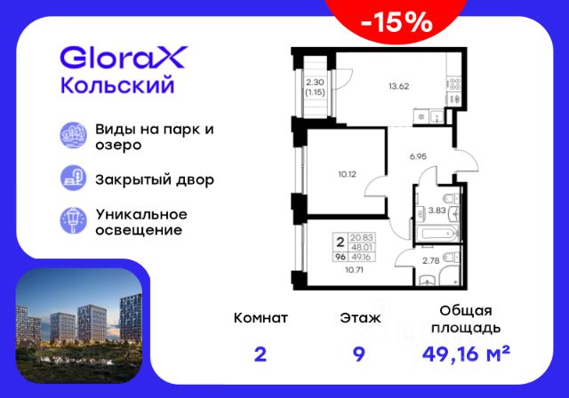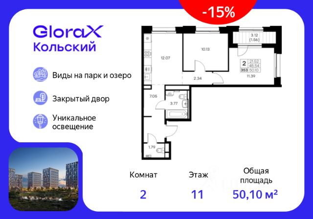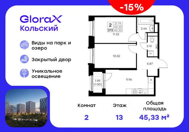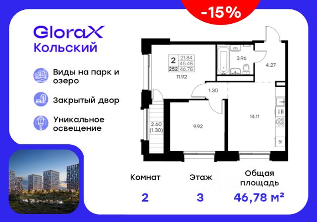 Продается 2-комн. квартира на 3-м этаже в проекте бизнес-класса GloraX Кольский. Общая площадь лота составляет 46,78 кв. м, из которых 21,84 кв. м отведено под жилую и 14,11 кв. м под кухонную зону. Номер квартиры - 252. Старт продаж! Преимущества квартиры: . - Масштабный проект комфорт-класса в зеленой локации - Лаконичная современная архитектура - Закрытая территория с видеонаблюдением - Квартиры с евро-планировками - Система "Умный дом" - IP-видеонаблюдение, free Wi-fi на территории - Детские разновозрастная площадка - Парк и озеро рядом с домом - Комьюнити-центр для жильцов GloraX Кольский — новая точка притяжения на карте Мурманска. Проект, который рожден на границе городского и природного, современного и вечного, уюта и великой северной силы. Мы создаем совершенно новое пространство для жизни: с видом на Варничное озеро, вблизи Долины Уюта, среди ландшафтов, в которых слышен голос Севера. Отсюда всего 10 минут на транспорте до центра города. Рядом — школы и детские сады, поликлиника, фитнес-центры и торговые комплексы. Поблизости — крупнейшие спортивные объекты Мурманска: легкоатлетический манеж, ледовая арена, горнолыжный склон и маршруты для скандинавской ходьбы. Мы проектировали дома, опираясь не только на эстетику, но и на климат, свет, направление ветра и рельеф. Это архитектура, которая не спорит с ландшафтом, а продолжает его сдержанно, точно и со вкусом. Фасады лаконичны, но выразительны. Материалы выбраны с учетом суровых условий Заполярья: устойчивые к ветру, снегу, перепадам температур. Но при всей практичности они не теряют визуальной легкости. Дом здесь словно вписан в северную линию горизонта — сдержанную, но бесконечно живую. Концепция благоустройства построена на идее "светового компаса": динамичная подсветка реагирует на смену суток и сезонов. Утром она бодрит, вечером — успокаивает, зимой создает акценты, имитируя северное сияние. Функциональность поддержана геопластикой: детские и спортивные площадки расположены на разных уровнях, словно террасы, спускающиеся к парку. Каждая из них спроектирована с учетом возраста, сценария и рельефа. Здесь есть зоны для малышей, подростков, воркаут-комплексы, настольный теннис, места для йоги и тихого отдыха. А в зимние месяцы склоны превращаются в естественные тюбинговые трассы. Но главное — парк. Долина Уюта — это не "рекреационная зона рядом". Это часть жизни, открытая с утра до вечера. Здесь бегают, выгуливают собак, катаются на лыжах и устраивают праздники. Проект вобрал лучшее из многолетнего опыта компании GloraX: лаконичная современная архитектура, закрытые дворы, продуманные сценарии освещения, вдохновленные полярными сутками, экологичный ландшафт и умный подход к комфорту. GloraX Кольский — для тех, кто влюблен в Север. И для тех, кто готов в него влюбиться. Цена указана при 100% оплате или стандартной ипотеке. Узнайте подробности в Отделе продаж. Продается 2-комнатная квартира в новостройке в Мурманске.