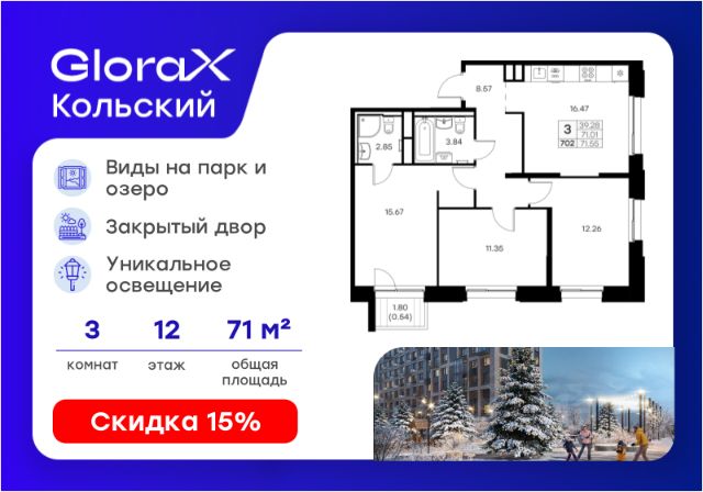 Продается 3-комн. квартира на 10-м этаже в проекте бизнес-класса GloraX Кольский. Общая площадь лота составляет 65,08 кв. м, из которых 35,25 кв. м отведено под жилую и 14,49 кв. м под кухонную зону. Номер квартиры - 681. Преимущества квартиры: евро-4; лоджия и остекленнный балкон; мастер-спальня. - Масштабный проект комфорт-класса в зеленой локации - Лаконичная современная архитектура - Закрытая территория с видеонаблюдением - Квартиры с евро-планировками - Система "Умный дом" - IP-видеонаблюдение, free Wi-fi на территории - Детские разновозрастные площадки - Парк и озеро рядом с домом - Комьюнити-центр для жильцов GloraX Кольский — новая точка притяжения на карте Мурманска. Проект, который рожден на границе городского и природного, современного и вечного, уюта и великой северной силы. Мы создаем совершенно новое пространство для жизни: с видом на Варничное озеро, вблизи Долины Уюта, среди ландшафтов, в которых слышен голос Севера. Отсюда всего 10 минут на транспорте до центра города. Рядом — школы и детские сады, поликлиника, фитнес-центры и торговые комплексы. Поблизости — крупнейшие спортивные объекты Мурманска: легкоатлетический манеж, ледовая арена, горнолыжный склон и маршруты для скандинавской ходьбы. Мы проектировали дома, опираясь не только на эстетику, но и на климат, свет, направление ветра и рельеф. Это архитектура, которая не спорит с ландшафтом, а продолжает его сдержанно, точно и со вкусом. Фасады лаконичны, но выразительны. Материалы выбраны с учетом суровых условий Заполярья: устойчивые к ветру, снегу, перепадам температур. Но при всей практичности они не теряют визуальной легкости. Дом здесь словно вписан в северную линию горизонта — сдержанную, но бесконечно живую. Концепция благоустройства построена на идее "светового компаса": динамичная подсветка реагирует на смену суток и сезонов. Утром она бодрит, вечером — успокаивает, зимой создает акценты, имитируя северное сияние. Функциональность поддержана геопластикой: детские и спортивные площадки расположены на разных уровнях, словно террасы, спускающиеся к парку. Каждая из них спроектирована с учетом возраста, сценария и рельефа. Здесь есть зоны для малышей, подростков, воркаут-комплексы, настольный теннис, места для йоги и тихого отдыха. А в зимние месяцы склоны превращаются в естественные тюбинговые трассы. Но главное — парк. Долина Уюта — это не "рекреационная зона рядом". Это часть жизни, открытая с утра до вечера. Здесь бегают, выгуливают собак, катаются на лыжах и устраивают праздники. Проект вобрал лучшее из многолетнего опыта компании GloraX: лаконичная современная архитектура, закрытые дворы, продуманные сценарии освещения, вдохновленные полярными сутками, экологичный ландшафт и умный подход к комфорту. GloraX Кольский — для тех, кто влюблен в Север. И для тех, кто готов в него влюбиться. Цена указана при 100% оплате или стандартной ипотеке. Узнайте подробности в Отделе продаж. Продам 3-комнатную квартиру с двумя санузлами в Мурманской области.