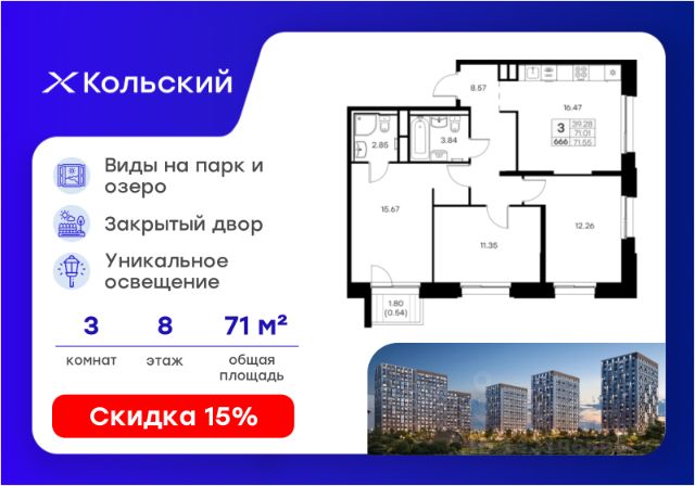 Продается 3-комн. квартира на 8-м этаже в проекте комфорт-класса Кольский. Общая площадь лота составляет 71,55 кв. м, из которых 39,28 кв. м отведено под жилую и 16,47 кв. м под кухонную зону. Номер квартиры - 666. Преимущества квартиры: евро-4; вид на озеро; остекленнный балкон; мастер-спальня. - Масштабный проект комфорт-класса в зеленой локации - Лаконичная современная архитектура - Закрытая территория с видеонаблюдением - Квартиры с евро-планировками - Система "Умный дом" - IP-видеонаблюдение, free Wi-fi на территории - Детские разновозрастные площадки - Парк и озеро рядом с домом - Комьюнити-центр для жильцов Кольский — новая точка притяжения на карте Мурманска. Проект, который рожден на границе городского и природного, современного и вечного, уюта и великой северной силы. Мы создаем совершенно новое пространство для жизни: с видом на Варничное озеро, вблизи Долины Уюта, среди ландшафтов, в которых слышен голос Севера. Отсюда всего 10 минут на транспорте до центра города. Рядом — школы и детские сады, поликлиника, фитнес-центры и торговые комплексы. Поблизости — крупнейшие спортивные объекты Мурманска: легкоатлетический манеж, ледовая арена, горнолыжный склон и маршруты для скандинавской ходьбы. Мы проектировали дома, опираясь не только на эстетику, но и на климат, свет, направление ветра и рельеф. Это архитектура, которая не спорит с ландшафтом, а продолжает его сдержанно, точно и со вкусом. Фасады лаконичны, но выразительны. Материалы выбраны с учетом суровых условий Заполярья: устойчивые к ветру, снегу, перепадам температур. Но при всей практичности они не теряют визуальной легкости. Дом здесь словно вписан в северную линию горизонта — сдержанную, но бесконечно живую. Концепция благоустройства построена на идее "светового компаса": динамичная подсветка реагирует на смену суток и сезонов. Утром она бодрит, вечером — успокаивает, зимой создает акценты, имитируя северное сияние. Функциональность поддержана геопластикой: детские и спортивные площадки расположены на разных уровнях, словно террасы, спускающиеся к парку. Каждая из них спроектирована с учетом возраста, сценария и рельефа. Здесь есть зоны для малышей, подростков, воркаут-комплексы, настольный теннис, места для йоги и тихого отдыха. А в зимние месяцы склоны превращаются в естественные тюбинговые трассы. Но главное — парк. Долина Уюта — это не "рекреационная зона рядом". Это часть жизни, открытая с утра до вечера. Здесь бегают, выгуливают собак, катаются на лыжах и устраивают праздники. Проект вобрал лучшее из многолетнего опыта компании GloraX: лаконичная современная архитектура, закрытые дворы, продуманные сценарии освещения, вдохновленные полярными сутками, экологичный ландшафт и умный подход к комфорту. Кольский — для тех, кто влюблен в Север. И для тех, кто готов в него влюбиться. Цена указана при 100% оплате или стандартной ипотеке. Узнайте подробности в Отделе продаж.