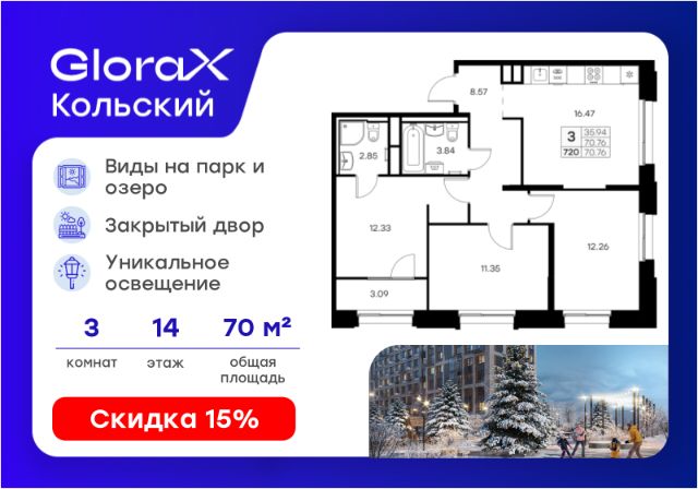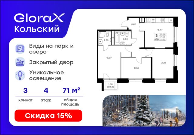 Продается 3-комн. квартира на 12-м этаже в проекте бизнес-класса GloraX Кольский. Общая площадь лота составляет 71,55 кв. м, из которых 39,28 кв. м отведено под жилую и 16,47 кв. м под кухонную зону. Номер квартиры - 702. Преимущества квартиры: евро-4; вид на озеро; остекленнный балкон; мастер-спальня. - Масштабный проект комфорт-класса в зеленой локации - Лаконичная современная архитектура - Закрытая территория с видеонаблюдением - Квартиры с евро-планировками - Система "Умный дом" - IP-видеонаблюдение, free Wi-fi на территории - Детские разновозрастные площадки - Парк и озеро рядом с домом - Комьюнити-центр для жильцов GloraX Кольский — новая точка притяжения на карте Мурманска. Проект, который рожден на границе городского и природного, современного и вечного, уюта и великой северной силы. Мы создаем совершенно новое пространство для жизни: с видом на Варничное озеро, вблизи Долины Уюта, среди ландшафтов, в которых слышен голос Севера. Отсюда всего 10 минут на транспорте до центра города. Рядом — школы и детские сады, поликлиника, фитнес-центры и торговые комплексы. Поблизости — крупнейшие спортивные объекты Мурманска: легкоатлетический манеж, ледовая арена, горнолыжный склон и маршруты для скандинавской ходьбы. Мы проектировали дома, опираясь не только на эстетику, но и на климат, свет, направление ветра и рельеф. Это архитектура, которая не спорит с ландшафтом, а продолжает его сдержанно, точно и со вкусом. Фасады лаконичны, но выразительны. Материалы выбраны с учетом суровых условий Заполярья: устойчивые к ветру, снегу, перепадам температур. Но при всей практичности они не теряют визуальной легкости. Дом здесь словно вписан в северную линию горизонта — сдержанную, но бесконечно живую. Концепция благоустройства построена на идее "светового компаса": динамичная подсветка реагирует на смену суток и сезонов. Утром она бодрит, вечером — успокаивает, зимой создает акценты, имитируя северное сияние. Функциональность поддержана геопластикой: детские и спортивные площадки расположены на разных уровнях, словно террасы, спускающиеся к парку. Каждая из них спроектирована с учетом возраста, сценария и рельефа. Здесь есть зоны для малышей, подростков, воркаут-комплексы, настольный теннис, места для йоги и тихого отдыха. А в зимние месяцы склоны превращаются в естественные тюбинговые трассы. Но главное — парк. Долина Уюта — это не "рекреационная зона рядом". Это часть жизни, открытая с утра до вечера. Здесь бегают, выгуливают собак, катаются на лыжах и устраивают праздники. Проект вобрал лучшее из многолетнего опыта компании GloraX: лаконичная современная архитектура, закрытые дворы, продуманные сценарии освещения, вдохновленные полярными сутками, экологичный ландшафт и умный подход к комфорту. GloraX Кольский — для тех, кто влюблен в Север. И для тех, кто готов в него влюбиться. Цена указана при 100% оплате или стандартной ипотеке. Узнайте подробности в Отделе продаж.