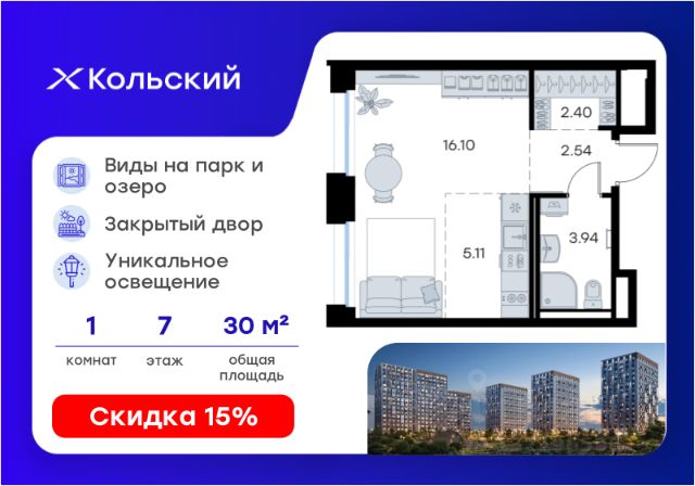 Продается квартира-студия на 7-м этаже в проекте бизнес-класса GloraX Кольский. Общая площадь лота составляет 30,09 кв. м, из которых 16,10 кв. м отведено под жилую и 5,11 кв. м под кухонную зону. Номер квартиры - 71. Старт продаж! Преимущества квартиры: . - Масштабный проект комфорт-класса в зеленой локации - Лаконичная современная архитектура - Закрытая территория с видеонаблюдением - Квартиры с евро-планировками - Система "Умный дом" - IP-видеонаблюдение, free Wi-fi на территории - Детские разновозрастная площадка - Парк и озеро рядом с домом - Комьюнити-центр для жильцов GloraX Кольский — новая точка притяжения на карте Мурманска. Проект, который рожден на границе городского и природного, современного и вечного, уюта и великой северной силы. Мы создаем совершенно новое пространство для жизни: с видом на Варничное озеро, вблизи Долины Уюта, среди ландшафтов, в которых слышен голос Севера. Отсюда всего 10 минут на транспорте до центра города. Рядом — школы и детские сады, поликлиника, фитнес-центры и торговые комплексы. Поблизости — крупнейшие спортивные объекты Мурманска: легкоатлетический манеж, ледовая арена, горнолыжный склон и маршруты для скандинавской ходьбы. Мы проектировали дома, опираясь не только на эстетику, но и на климат, свет, направление ветра и рельеф. Это архитектура, которая не спорит с ландшафтом, а продолжает его сдержанно, точно и со вкусом. Фасады лаконичны, но выразительны. Материалы выбраны с учетом суровых условий Заполярья: устойчивые к ветру, снегу, перепадам температур. Но при всей практичности они не теряют визуальной легкости. Дом здесь словно вписан в северную линию горизонта — сдержанную, но бесконечно живую. Концепция благоустройства построена на идее "светового компаса": динамичная подсветка реагирует на смену суток и сезонов. Утром она бодрит, вечером — успокаивает, зимой создает акценты, имитируя северное сияние. Функциональность поддержана геопластикой: детские и спортивные площадки расположены на разных уровнях, словно террасы, спускающиеся к парку. Каждая из них спроектирована с учетом возраста, сценария и рельефа. Здесь есть зоны для малышей, подростков, воркаут-комплексы, настольный теннис, места для йоги и тихого отдыха. А в зимние месяцы склоны превращаются в естественные тюбинговые трассы. Но главное — парк. Долина Уюта — это не "рекреационная зона рядом". Это часть жизни, открытая с утра до вечера. Здесь бегают, выгуливают собак, катаются на лыжах и устраивают праздники. Проект вобрал лучшее из многолетнего опыта компании GloraX: лаконичная современная архитектура, закрытые дворы, продуманные сценарии освещения, вдохновленные полярными сутками, экологичный ландшафт и умный подход к комфорту. GloraX Кольский — для тех, кто влюблен в Север. И для тех, кто готов в него влюбиться. Цена указана при 100% оплате или стандартной ипотеке. Узнайте подробности в Отделе продаж. Купить квартиру до 4,6 млн. рублей в Мурманской области.