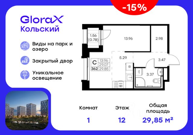 Продается квартира-студия на 12-м этаже в проекте бизнес-класса GloraX Кольский. Общая площадь лота составляет 29,30 кв. м, из которых 14,84 кв. м отведено под жилую и 5,94 кв. м под кухонную зону. Номер квартиры - 368. Старт продаж! Преимущества квартиры: зонируемая студия. - Масштабный проект комфорт-класса в зеленой локации - Лаконичная современная архитектура - Закрытая территория с видеонаблюдением - Квартиры с евро-планировками - Система "Умный дом" - IP-видеонаблюдение, free Wi-fi на территории - Детские разновозрастные площадки - Парк и озеро рядом с домом - Комьюнити-центр для жильцов GloraX Кольский — новая точка притяжения на карте Мурманска. Проект, который рожден на границе городского и природного, современного и вечного, уюта и великой северной силы. Мы создаем совершенно новое пространство для жизни: с видом на Варничное озеро, вблизи Долины Уюта, среди ландшафтов, в которых слышен голос Севера. Отсюда всего 10 минут на транспорте до центра города. Рядом — школы и детские сады, поликлиника, фитнес-центры и торговые комплексы. Поблизости — крупнейшие спортивные объекты Мурманска: легкоатлетический манеж, ледовая арена, горнолыжный склон и маршруты для скандинавской ходьбы. Мы проектировали дома, опираясь не только на эстетику, но и на климат, свет, направление ветра и рельеф. Это архитектура, которая не спорит с ландшафтом, а продолжает его сдержанно, точно и со вкусом. Фасады лаконичны, но выразительны. Материалы выбраны с учетом суровых условий Заполярья: устойчивые к ветру, снегу, перепадам температур. Но при всей практичности они не теряют визуальной легкости. Дом здесь словно вписан в северную линию горизонта — сдержанную, но бесконечно живую. Концепция благоустройства построена на идее "светового компаса": динамичная подсветка реагирует на смену суток и сезонов. Утром она бодрит, вечером — успокаивает, зимой создает акценты, имитируя северное сияние. Функциональность поддержана геопластикой: детские и спортивные площадки расположены на разных уровнях, словно террасы, спускающиеся к парку. Каждая из них спроектирована с учетом возраста, сценария и рельефа. Здесь есть зоны для малышей, подростков, воркаут-комплексы, настольный теннис, места для йоги и тихого отдыха. А в зимние месяцы склоны превращаются в естественные тюбинговые трассы. Но главное — парк. Долина Уюта — это не "рекреационная зона рядом". Это часть жизни, открытая с утра до вечера. Здесь бегают, выгуливают собак, катаются на лыжах и устраивают праздники. Проект вобрал лучшее из многолетнего опыта компании GloraX: лаконичная современная архитектура, закрытые дворы, продуманные сценарии освещения, вдохновленные полярными сутками, экологичный ландшафт и умный подход к комфорту. GloraX Кольский — для тех, кто влюблен в Север. И для тех, кто готов в него влюбиться. Цена указана при 100% оплате или стандартной ипотеке. Узнайте подробности в Отделе продаж.