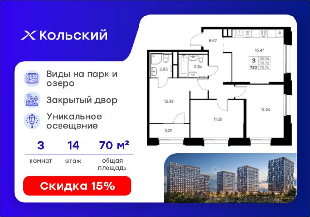 Продается 2-комн. квартира на 14-м этаже в проекте комфорт-класса Кольский. Общая площадь лота составляет 44,61 кв. м, из которых 21,00 кв. м отведено под жилую и 11,92 кв. м под кухонную зону. Номер квартиры - 715. Преимущества квартиры: угловая, евро-2; лоджия. - Масштабный проект комфорт-класса в зеленой локации - Лаконичная современная архитектура - Закрытая территория с видеонаблюдением - Квартиры с евро-планировками - Система "Умный дом" - IP-видеонаблюдение, free Wi-fi на территории - Детские разновозрастные площадки - Парк и озеро рядом с домом - Комьюнити-центр для жильцов Кольский — новая точка притяжения на карте Мурманска. Проект, который рожден на границе городского и природного, современного и вечного, уюта и великой северной силы. Мы создаем совершенно новое пространство для жизни: с видом на Варничное озеро, вблизи Долины Уюта, среди ландшафтов, в которых слышен голос Севера. Отсюда всего 10 минут на транспорте до центра города. Рядом — школы и детские сады, поликлиника, фитнес-центры и торговые комплексы. Поблизости — крупнейшие спортивные объекты Мурманска: легкоатлетический манеж, ледовая арена, горнолыжный склон и маршруты для скандинавской ходьбы. Мы проектировали дома, опираясь не только на эстетику, но и на климат, свет, направление ветра и рельеф. Это архитектура, которая не спорит с ландшафтом, а продолжает его сдержанно, точно и со вкусом. Фасады лаконичны, но выразительны. Материалы выбраны с учетом суровых условий Заполярья: устойчивые к ветру, снегу, перепадам температур. Но при всей практичности они не теряют визуальной легкости. Дом здесь словно вписан в северную линию горизонта — сдержанную, но бесконечно живую. Концепция благоустройства построена на идее "светового компаса": динамичная подсветка реагирует на смену суток и сезонов. Утром она бодрит, вечером — успокаивает, зимой создает акценты, имитируя северное сияние. Функциональность поддержана геопластикой: детские и спортивные площадки расположены на разных уровнях, словно террасы, спускающиеся к парку. Каждая из них спроектирована с учетом возраста, сценария и рельефа. Здесь есть зоны для малышей, подростков, воркаут-комплексы, настольный теннис, места для йоги и тихого отдыха. А в зимние месяцы склоны превращаются в естественные тюбинговые трассы. Но главное — парк. Долина Уюта — это не "рекреационная зона рядом". Это часть жизни, открытая с утра до вечера. Здесь бегают, выгуливают собак, катаются на лыжах и устраивают праздники. Проект вобрал лучшее из многолетнего опыта компании GloraX: лаконичная современная архитектура, закрытые дворы, продуманные сценарии освещения, вдохновленные полярными сутками, экологичный ландшафт и умный подход к комфорту. Кольский — для тех, кто влюблен в Север. И для тех, кто готов в него влюбиться. Цена указана при 100% оплате или стандартной ипотеке. Узнайте подробности в Отделе продаж.