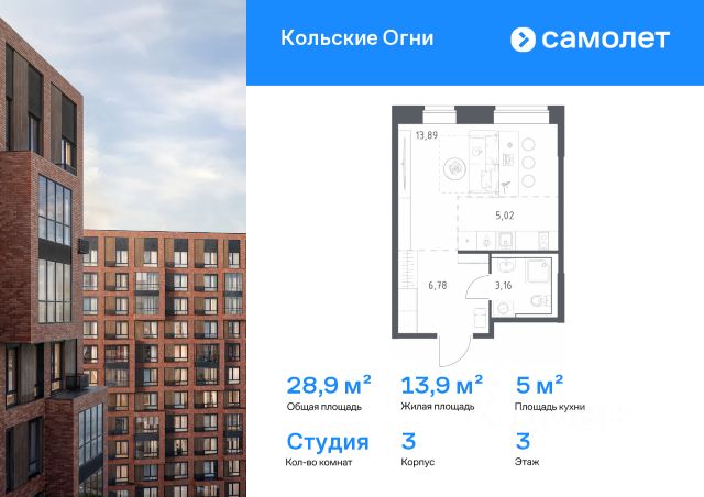 Строим кварталы для жизни с заботой о будущем. Предлагается квартира студия комфорт-класса 28,85 кв.м в корпусе 3 на 3 этаже, в ЖК "Кольские Огни" Квартира без отделки. Доступность опции "отделка" и возможность комплектации мебелью и декором уточняйте у застройщика. Приобрести квартиру возможно по специальным акциям от застройщика, с текущими условиями акций можно ознакомиться в блоке "Акций". Цена динамическая и может отличаться, уточняйте актуальность у застройщика. Жилой комплекс "Кольские Огни" будет построен в Мурманской области, в городе Кола. Путь до центра Мурманска будет быстрым — всего 25 минут на машине. Рядом — Поморская набережная, парк, тундровый сад и лес всего в 10 минутах пешком. На первых этажах домов откроются кофейни и магазины, фитнес-зал и салон красоты, аптека, пункты выдачи заказов. Рядом с жилым комплексом работают детский сад, спортивная школа с бассейном и ФОК. Во дворе — озеленение, спортивные площадки, ремонт велосипедов, догхабы. Еще на территории квартала построим паркинг с зарядкой для электромобилей. Корпуса высотой 912 этажей и 1417-этажные башни украшают деревянные панели. На входе в подъезды не будет ступеней и высоких порогов. После прогулки велосипеды и коляски можно оставить в местах хранения. Продуманные планировки от небольших студий до просторных 4-комнатных квартир. Отделка на выбор: готовая, White Box или вариант без нее. Выбирайте варианты без отделки, если хотите реализовать собственные решения.