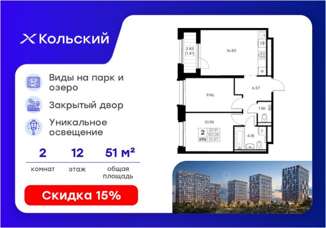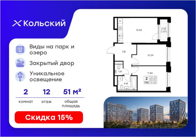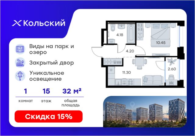 Строим кварталы для жизни с заботой о будущем. Предлагается студия комфорт-класса площадью 28.59 кв.м в корпусе 3КВ на 11-м этаже, в жилом комплексе "Кольские Огни". Среди планировок квартала вы наверняка найдете ту, что подойдет вашему образу жизни. В эргономичной студии будет уютно молодой паре, а просторный 4-комнатный вариант подойдет для большой и дружной семьи. Квартиры сдаются без отделки, а значит, вы легко сможете воплотить даже самые смелые дизайнерские идеи. Создавайте свой интерьер мечты и приглашайте друзей на новоселье. Приобрести квартиры возможно по специальным акциям от застройщика, с текущими условиями акций можно ознакомиться в блоке "Акций". Цена динамическая и может отличаться, уточняйте актуальность у застройщика. Жилой комплекс "Кольские Огни" будет построен в Мурманской области, в городе Кола. Путь до центра Мурманска будет быстрым — всего 25 минут на машине. Рядом — Поморская набережная, парк, тундровый сад и лес всего в 10 минутах пешком. На первых этажах домов откроются кофейни и магазины, фитнес-зал и салон красоты, аптека, пункты выдачи заказов. Рядом с жилым комплексом работают детский сад, спортивная школа с бассейном и ФОК. Во дворе — озеленение, спортивные площадки, ремонт велосипедов, догхабы. Еще на территории квартала построим паркинг с зарядкой для электромобилей. Корпуса высотой 912 этажей и 1417-этажные башни украшают деревянные панели. На входе в подъезды не будет ступеней и высоких порогов. После прогулки велосипеды и коляски можно оставить в местах хранения. Продуманные планировки от небольших студий до просторных 4-комнатных квартир. Отделка на выбор: готовая, White Box или вариант без нее. Выбирайте варианты без отделки, если хотите реализовать собственные решения.