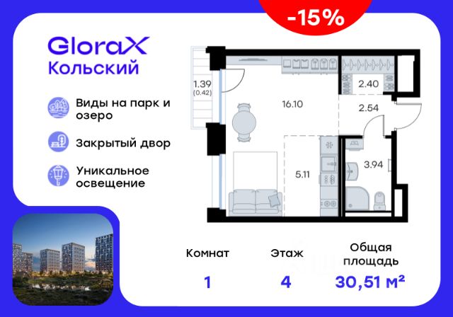 Продается квартира-студия на 2-м этаже в проекте бизнес-класса GloraX Кольский. Общая площадь лота составляет 29,30 кв. м, из которых 14,78 кв. м отведено под жилую и 5,96 кв. м под кухонную зону. Номер квартиры - 4. Старт продаж! Преимущества квартиры: зонируемая студия. - Масштабный проект комфорт-класса в зеленой локации - Лаконичная современная архитектура - Закрытая территория с видеонаблюдением - Квартиры с евро-планировками - Система "Умный дом" - IP-видеонаблюдение, free Wi-fi на территории - Детские разновозрастные площадки - Парк и озеро рядом с домом - Комьюнити-центр для жильцов GloraX Кольский — новая точка притяжения на карте Мурманска. Проект, который рожден на границе городского и природного, современного и вечного, уюта и великой северной силы. Мы создаем совершенно новое пространство для жизни: с видом на Варничное озеро, вблизи Долины Уюта, среди ландшафтов, в которых слышен голос Севера. Отсюда всего 10 минут на транспорте до центра города. Рядом — школы и детские сады, поликлиника, фитнес-центры и торговые комплексы. Поблизости — крупнейшие спортивные объекты Мурманска: легкоатлетический манеж, ледовая арена, горнолыжный склон и маршруты для скандинавской ходьбы. Мы проектировали дома, опираясь не только на эстетику, но и на климат, свет, направление ветра и рельеф. Это архитектура, которая не спорит с ландшафтом, а продолжает его сдержанно, точно и со вкусом. Фасады лаконичны, но выразительны. Материалы выбраны с учетом суровых условий Заполярья: устойчивые к ветру, снегу, перепадам температур. Но при всей практичности они не теряют визуальной легкости. Дом здесь словно вписан в северную линию горизонта — сдержанную, но бесконечно живую. Концепция благоустройства построена на идее "светового компаса": динамичная подсветка реагирует на смену суток и сезонов. Утром она бодрит, вечером — успокаивает, зимой создает акценты, имитируя северное сияние. Функциональность поддержана геопластикой: детские и спортивные площадки расположены на разных уровнях, словно террасы, спускающиеся к парку. Каждая из них спроектирована с учетом возраста, сценария и рельефа. Здесь есть зоны для малышей, подростков, воркаут-комплексы, настольный теннис, места для йоги и тихого отдыха. А в зимние месяцы склоны превращаются в естественные тюбинговые трассы. Но главное — парк. Долина Уюта — это не "рекреационная зона рядом". Это часть жизни, открытая с утра до вечера. Здесь бегают, выгуливают собак, катаются на лыжах и устраивают праздники. Проект вобрал лучшее из многолетнего опыта компании GloraX: лаконичная современная архитектура, закрытые дворы, продуманные сценарии освещения, вдохновленные полярными сутками, экологичный ландшафт и умный подход к комфорту. GloraX Кольский — для тех, кто влюблен в Север. И для тех, кто готов в него влюбиться. Цена указана при 100% оплате или стандартной ипотеке. Узнайте подробности в Отделе продаж.