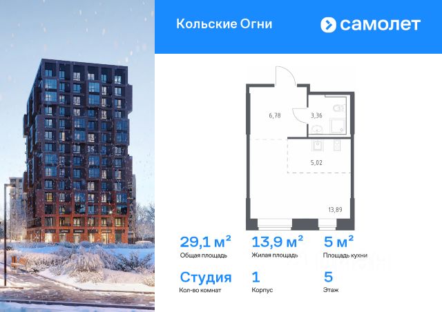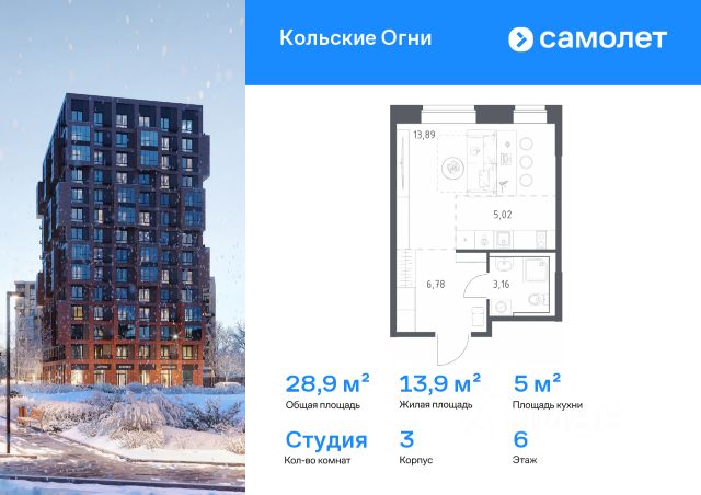 Строим кварталы для жизни с заботой о будущем. Предлагается квартира студия комфорт-класса 28,85 кв.м в корпусе 3 на 13 этаже, в ЖК "Кольские Огни" Квартира без отделки. Доступность опции "отделка" и возможность комплектации мебелью и декором уточняйте у застройщика. Приобрести квартиру возможно по специальным акциям от застройщика, с текущими условиями акций можно ознакомиться в блоке "Акций". Цена динамическая и может отличаться, уточняйте актуальность у застройщика. Жилой комплекс "Кольские Огни" будет построен в Мурманской области, в городе Кола. Путь до центра Мурманска будет быстрым — всего 25 минут на машине. Рядом — Поморская набережная, парк, тундровый сад и лес всего в 10 минутах пешком. На первых этажах домов откроются кофейни и магазины, фитнес-зал и салон красоты, аптека, пункты выдачи заказов. Рядом с жилым комплексом работают детский сад, спортивная школа с бассейном и ФОК. Во дворе — озеленение, спортивные площадки, ремонт велосипедов, догхабы. Еще на территории квартала построим паркинг с зарядкой для электромобилей. Корпуса высотой 912 этажей и 1417-этажные башни украшают деревянные панели. На входе в подъезды не будет ступеней и высоких порогов. После прогулки велосипеды и коляски можно оставить в местах хранения. Продуманные планировки от небольших студий до просторных 4-комнатных квартир. Отделка на выбор: готовая, White Box или вариант без нее. Выбирайте варианты без отделки, если хотите реализовать собственные решения.