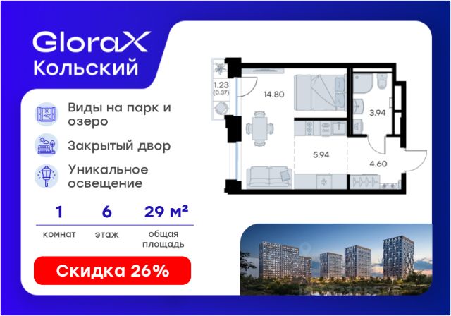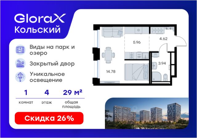 Продается квартира-студия на 2-м этаже в проекте бизнес-класса GloraX Кольский. Общая площадь лота составляет 29,30 кв. м, из которых 14,78 кв. м отведено под жилую и 5,96 кв. м под кухонную зону. Номер квартиры - 4. Старт продаж! Преимущества квартиры: зонируемая студия. - Масштабный проект комфорт-класса в зеленой локации - Лаконичная современная архитектура - Закрытая территория с видеонаблюдением - Квартиры с евро-планировками - Система "Умный дом" - IP-видеонаблюдение, free Wi-fi на территории - Детские разновозрастные площадки - Парк и озеро рядом с домом - Комьюнити-центр для жильцов GloraX Кольский — новая точка притяжения на карте Мурманска. Проект, который рожден на границе городского и природного, современного и вечного, уюта и великой северной силы. Мы создаем совершенно новое пространство для жизни: с видом на Варничное озеро, вблизи Долины Уюта, среди ландшафтов, в которых слышен голос Севера. Отсюда всего 10 минут на транспорте до центра города. Рядом — школы и детские сады, поликлиника, фитнес-центры и торговые комплексы. Поблизости — крупнейшие спортивные объекты Мурманска: легкоатлетический манеж, ледовая арена, горнолыжный склон и маршруты для скандинавской ходьбы. Мы проектировали дома, опираясь не только на эстетику, но и на климат, свет, направление ветра и рельеф. Это архитектура, которая не спорит с ландшафтом, а продолжает его сдержанно, точно и со вкусом. Фасады лаконичны, но выразительны. Материалы выбраны с учетом суровых условий Заполярья: устойчивые к ветру, снегу, перепадам температур. Но при всей практичности они не теряют визуальной легкости. Дом здесь словно вписан в северную линию горизонта — сдержанную, но бесконечно живую. Концепция благоустройства построена на идее "светового компаса": динамичная подсветка реагирует на смену суток и сезонов. Утром она бодрит, вечером — успокаивает, зимой создает акценты, имитируя северное сияние. Функциональность поддержана геопластикой: детские и спортивные площадки расположены на разных уровнях, словно террасы, спускающиеся к парку. Каждая из них спроектирована с учетом возраста, сценария и рельефа. Здесь есть зоны для малышей, подростков, воркаут-комплексы, настольный теннис, места для йоги и тихого отдыха. А в зимние месяцы склоны превращаются в естественные тюбинговые трассы. Но главное — парк. Долина Уюта — это не "рекреационная зона рядом". Это часть жизни, открытая с утра до вечера. Здесь бегают, выгуливают собак, катаются на лыжах и устраивают праздники. Проект вобрал лучшее из многолетнего опыта компании GloraX: лаконичная современная архитектура, закрытые дворы, продуманные сценарии освещения, вдохновленные полярными сутками, экологичный ландшафт и умный подход к комфорту. GloraX Кольский — для тех, кто влюблен в Север. И для тех, кто готов в него влюбиться. Цена указана при 100% оплате или стандартной ипотеке. Узнайте подробности в Отделе продаж.