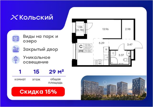 Продается квартира-студия на 3-м этаже в проекте комфорт-класса Кольский. Общая площадь лота составляет 29,30 кв. м, из которых 14,78 кв. м отведено под жилую и 5,96 кв. м под кухонную зону. Номер квартиры - 17. Преимущества квартиры: зонируемая студия. - Масштабный проект комфорт-класса в зеленой локации - Лаконичная современная архитектура - Закрытая территория с видеонаблюдением - Квартиры с евро-планировками - Система "Умный дом" - IP-видеонаблюдение, free Wi-fi на территории - Детские разновозрастные площадки - Парк и озеро рядом с домом - Комьюнити-центр для жильцов Кольский — новая точка притяжения на карте Мурманска. Проект, который рожден на границе городского и природного, современного и вечного, уюта и великой северной силы. Мы создаем совершенно новое пространство для жизни: с видом на Варничное озеро, вблизи Долины Уюта, среди ландшафтов, в которых слышен голос Севера. Отсюда всего 10 минут на транспорте до центра города. Рядом — школы и детские сады, поликлиника, фитнес-центры и торговые комплексы. Поблизости — крупнейшие спортивные объекты Мурманска: легкоатлетический манеж, ледовая арена, горнолыжный склон и маршруты для скандинавской ходьбы. Мы проектировали дома, опираясь не только на эстетику, но и на климат, свет, направление ветра и рельеф. Это архитектура, которая не спорит с ландшафтом, а продолжает его сдержанно, точно и со вкусом. Фасады лаконичны, но выразительны. Материалы выбраны с учетом суровых условий Заполярья: устойчивые к ветру, снегу, перепадам температур. Но при всей практичности они не теряют визуальной легкости. Дом здесь словно вписан в северную линию горизонта — сдержанную, но бесконечно живую. Концепция благоустройства построена на идее "светового компаса": динамичная подсветка реагирует на смену суток и сезонов. Утром она бодрит, вечером — успокаивает, зимой создает акценты, имитируя северное сияние. Функциональность поддержана геопластикой: детские и спортивные площадки расположены на разных уровнях, словно террасы, спускающиеся к парку. Каждая из них спроектирована с учетом возраста, сценария и рельефа. Здесь есть зоны для малышей, подростков, воркаут-комплексы, настольный теннис, места для йоги и тихого отдыха. А в зимние месяцы склоны превращаются в естественные тюбинговые трассы. Но главное — парк. Долина Уюта — это не "рекреационная зона рядом". Это часть жизни, открытая с утра до вечера. Здесь бегают, выгуливают собак, катаются на лыжах и устраивают праздники. Проект вобрал лучшее из многолетнего опыта компании GloraX: лаконичная современная архитектура, закрытые дворы, продуманные сценарии освещения, вдохновленные полярными сутками, экологичный ландшафт и умный подход к комфорту. Кольский — для тех, кто влюблен в Север. И для тех, кто готов в него влюбиться. Цена указана при 100% оплате или стандартной ипотеке. Узнайте подробности в Отделе продаж.