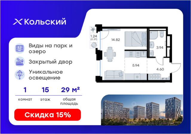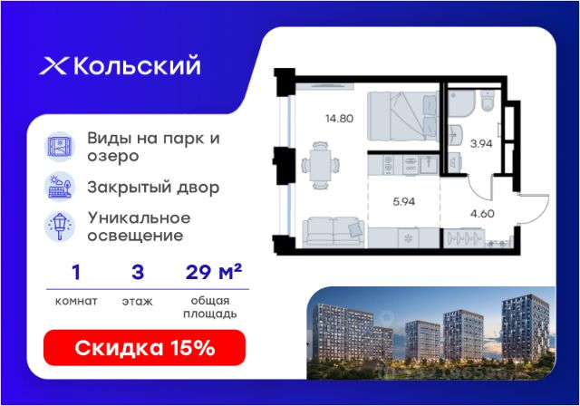 Продается квартира-студия на 7-м этаже в проекте бизнес-класса GloraX Кольский. Общая площадь лота составляет 29,30 кв. м, из которых 14,84 кв. м отведено под жилую и 5,94 кв. м под кухонную зону. Номер квартиры - 308. Старт продаж! Преимущества квартиры: . - Масштабный проект комфорт-класса в зеленой локации - Лаконичная современная архитектура - Закрытая территория с видеонаблюдением - Квартиры с евро-планировками - Система "Умный дом" - IP-видеонаблюдение, free Wi-fi на территории - Детские разновозрастная площадка - Парк и озеро рядом с домом - Комьюнити-центр для жильцов GloraX Кольский — новая точка притяжения на карте Мурманска. Проект, который рожден на границе городского и природного, современного и вечного, уюта и великой северной силы. Мы создаем совершенно новое пространство для жизни: с видом на Варничное озеро, вблизи Долины Уюта, среди ландшафтов, в которых слышен голос Севера. Отсюда всего 10 минут на транспорте до центра города. Рядом — школы и детские сады, поликлиника, фитнес-центры и торговые комплексы. Поблизости — крупнейшие спортивные объекты Мурманска: легкоатлетический манеж, ледовая арена, горнолыжный склон и маршруты для скандинавской ходьбы. Мы проектировали дома, опираясь не только на эстетику, но и на климат, свет, направление ветра и рельеф. Это архитектура, которая не спорит с ландшафтом, а продолжает его сдержанно, точно и со вкусом. Фасады лаконичны, но выразительны. Материалы выбраны с учетом суровых условий Заполярья: устойчивые к ветру, снегу, перепадам температур. Но при всей практичности они не теряют визуальной легкости. Дом здесь словно вписан в северную линию горизонта — сдержанную, но бесконечно живую. Концепция благоустройства построена на идее "светового компаса": динамичная подсветка реагирует на смену суток и сезонов. Утром она бодрит, вечером — успокаивает, зимой создает акценты, имитируя северное сияние. Функциональность поддержана геопластикой: детские и спортивные площадки расположены на разных уровнях, словно террасы, спускающиеся к парку. Каждая из них спроектирована с учетом возраста, сценария и рельефа. Здесь есть зоны для малышей, подростков, воркаут-комплексы, настольный теннис, места для йоги и тихого отдыха. А в зимние месяцы склоны превращаются в естественные тюбинговые трассы. Но главное — парк. Долина Уюта — это не "рекреационная зона рядом". Это часть жизни, открытая с утра до вечера. Здесь бегают, выгуливают собак, катаются на лыжах и устраивают праздники. Проект вобрал лучшее из многолетнего опыта компании GloraX: лаконичная современная архитектура, закрытые дворы, продуманные сценарии освещения, вдохновленные полярными сутками, экологичный ландшафт и умный подход к комфорту. GloraX Кольский — для тех, кто влюблен в Север. И для тех, кто готов в него влюбиться. Цена указана при 100% оплате или стандартной ипотеке. Узнайте подробности в Отделе продаж.