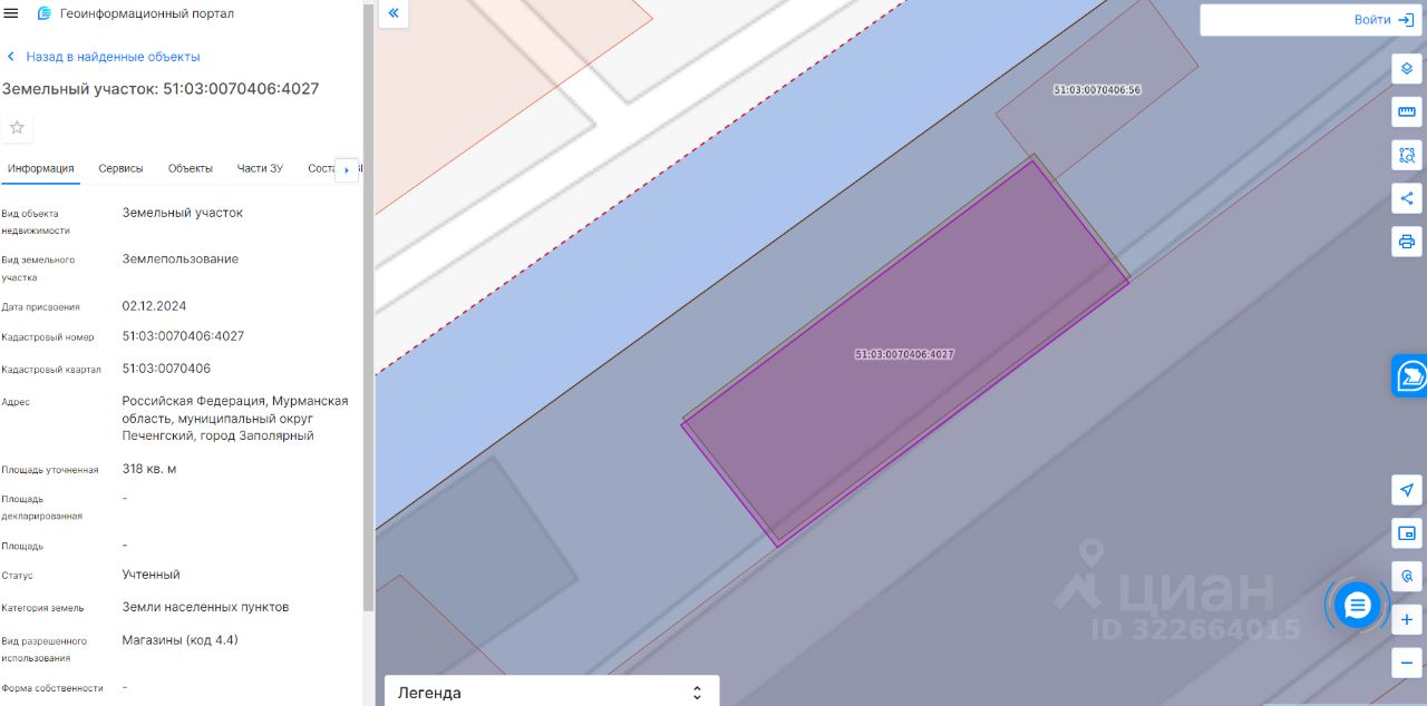 Земельный участок с кадастровым номером 51:03:0070406:4027 площадь 318 по адресу Российская Федерация, Мурманская область, муниципальный округ Печенгский, город Заполярный