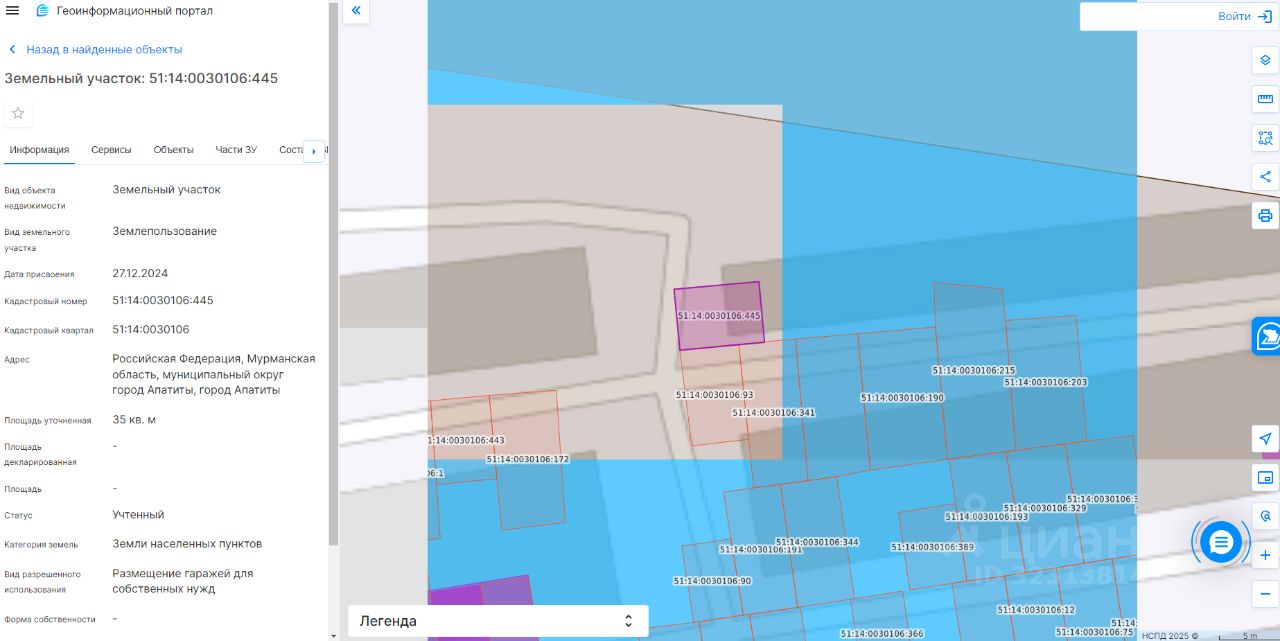 Земельный участок с кадастровым номером 51:14:0030106:445, площадь 35, по адресу Российская Федерация, Мурманская область, муниципальный округ город Апатиты, город Апатиты