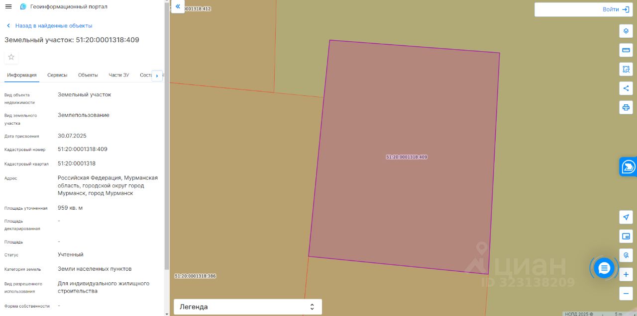 Земельный участок с кадастровым номером 51:20:0001318:409. площадь 959, по адресу Российская Федерация, Мурманская область, городской округ город Мурманск, город Мурманск