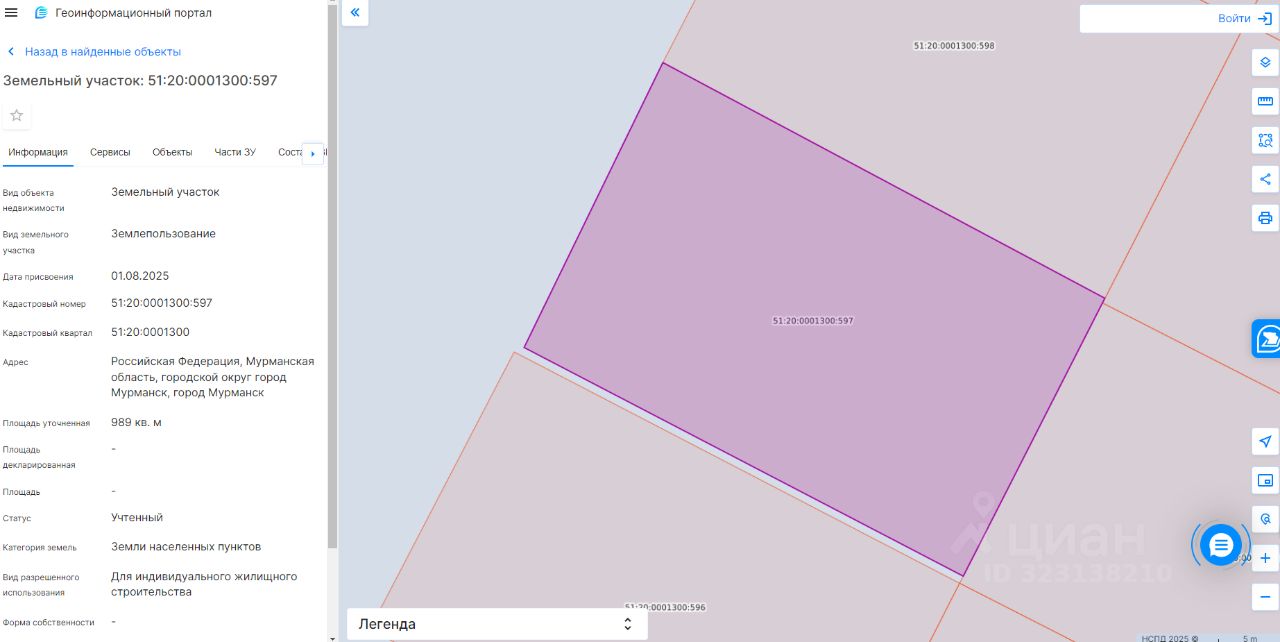 Земельный участок с кадастровым номером 51:20:0001300:597, площадь 989, по адресу Российская Федерация, Мурманская область, городской округ город Мурманск, город Мурманск