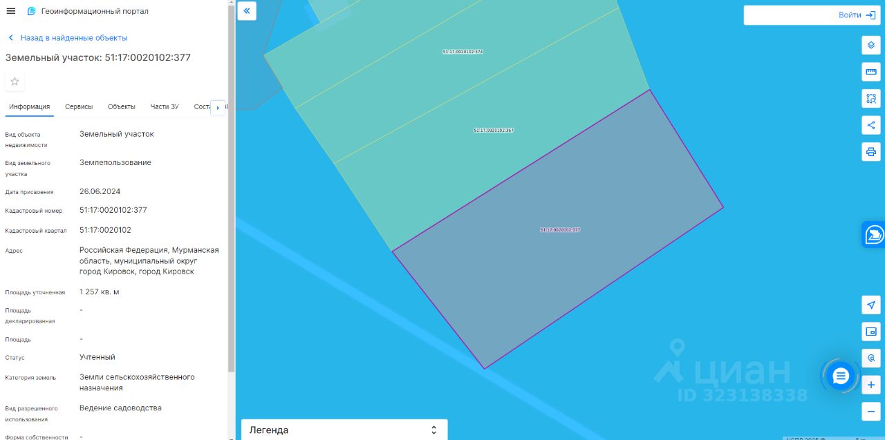Земельный участок с кадастровым номером 51:17:0020102:377, площадь 1257, по адресу Российская Федерация, Мурманская область, муниципальный округ город Кировск, город Кировск