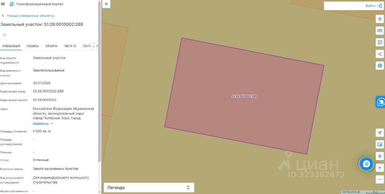 Земельный участок с кадастровым номером 51:28:0010002:289 площадь 1000 по адресу Российская Федерация, Мурманская область, муниципальный округ город Полярные Зори, город Полярные Зори
