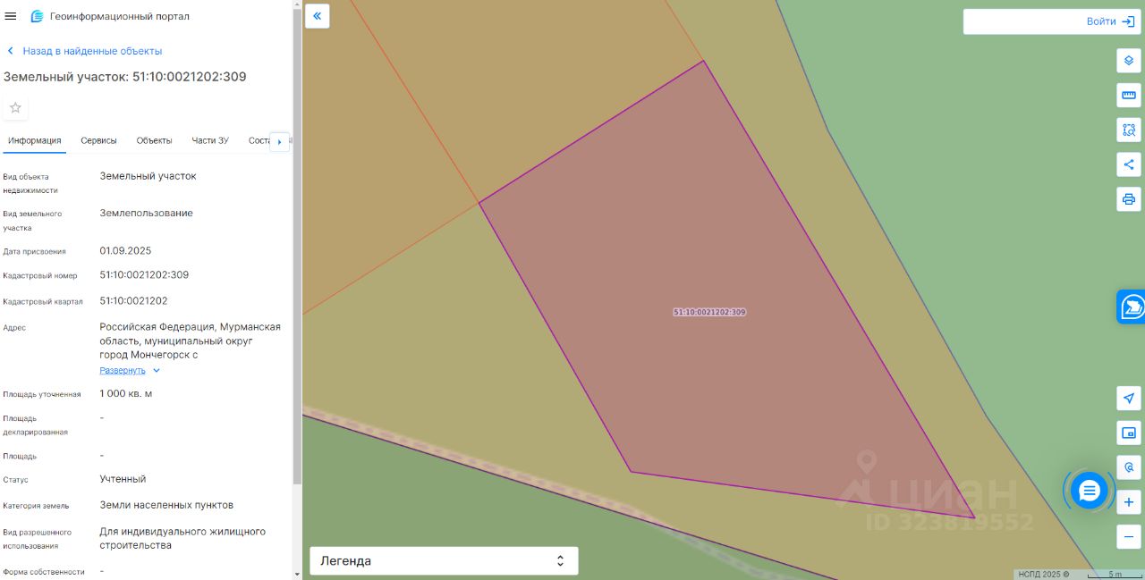 Земельный участок с кадастровым номером 51:10:0021202:309 площадь 1000 по адресу Российская Федерация, Мурманская область, муниципальный округ город Мончегорск с подведомственной территорией, город Мончегорск, улица Безымянный Ручей