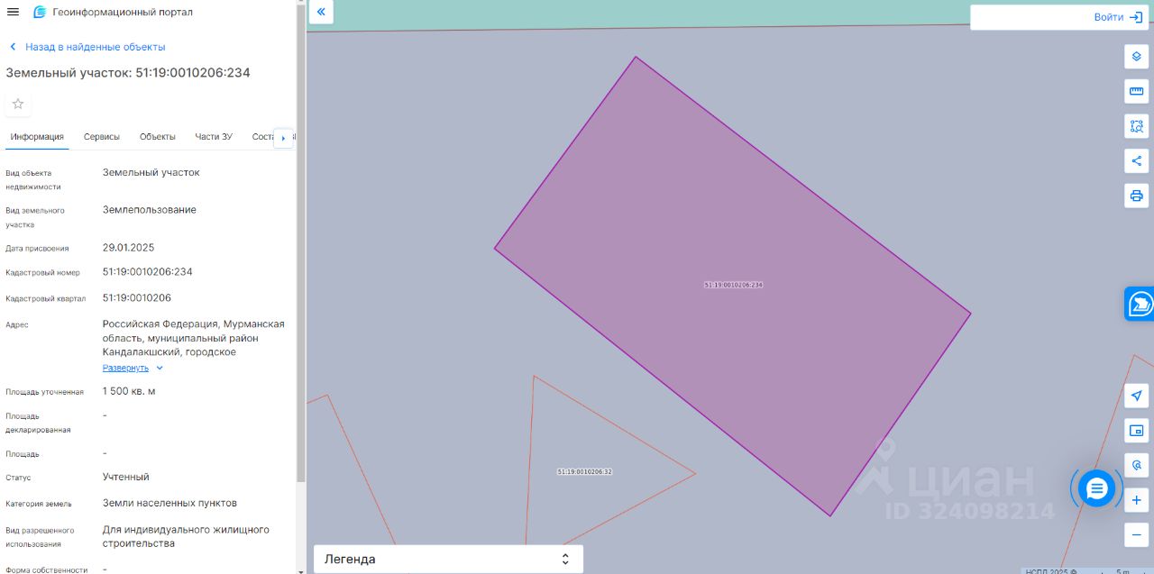 Земельный участок с кадастровым номером 51:19:0010206:234 площадь 1500 по адресу Российская Федерация, Мурманская область, муниципальный район Кандалакшский, городское поселение Кандалакша, село Лувеньга