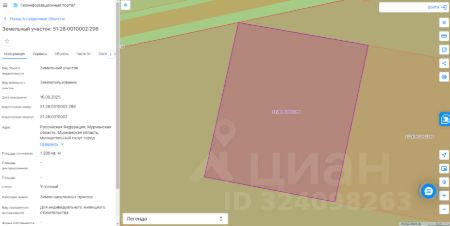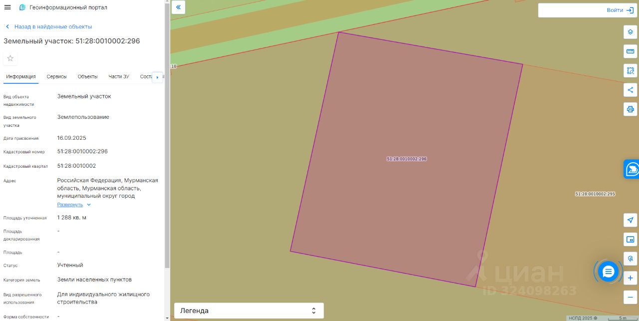 Земельный участок с кадастровым номером 51:28:0010002:296 площадь 1288 по адресу Российская Федерация, Мурманская область, Мурманская область, муниципальный округ город Полярные Зори, город Полярные Зори