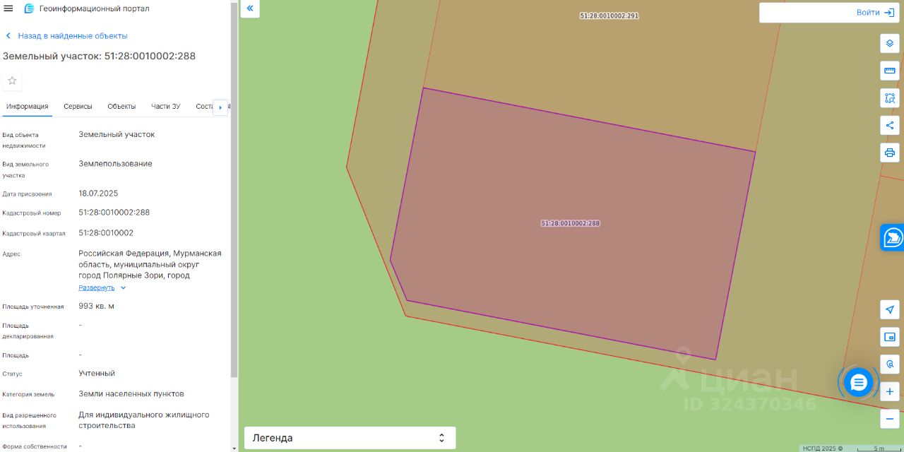 Земельный участок с кадастровым номером 51:28:0010002:288 площадь 993 по адресу Российская Федерация, Мурманская область, муниципальный округ город Полярные Зори, город Полярные Зори