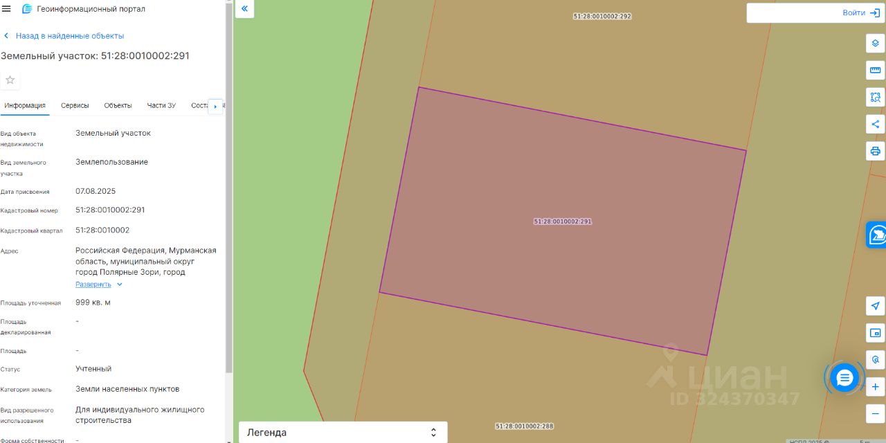 Земельный участок с кадастровым номером 51:28:0010002:291 площадь 999 по адресу Российская Федерация, Мурманская область, муниципальный округ город Полярные Зори, город Полярные Зори