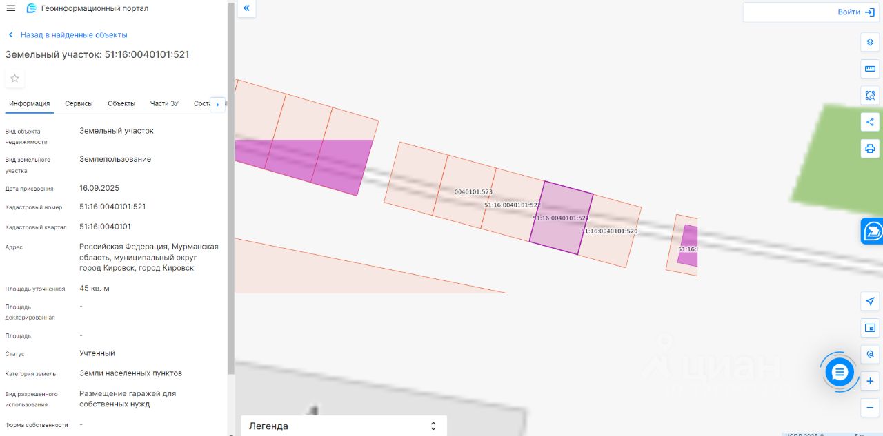 Земельный участок с кадастровым номером 51:16:0040101:521 площадь 45 по адресу Российская Федерация, Мурманская область, муниципальный округ город Кировск, город Кировск