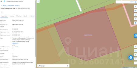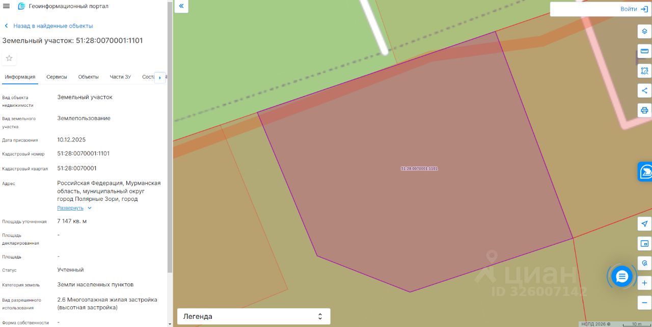 Земельный участок с кадастровым номером 51:28:0070001:1101 площадь 7147 по адресу Российская Федерация, Мурманская область, муниципальный округ город Полярные Зори, город Полярные Зори