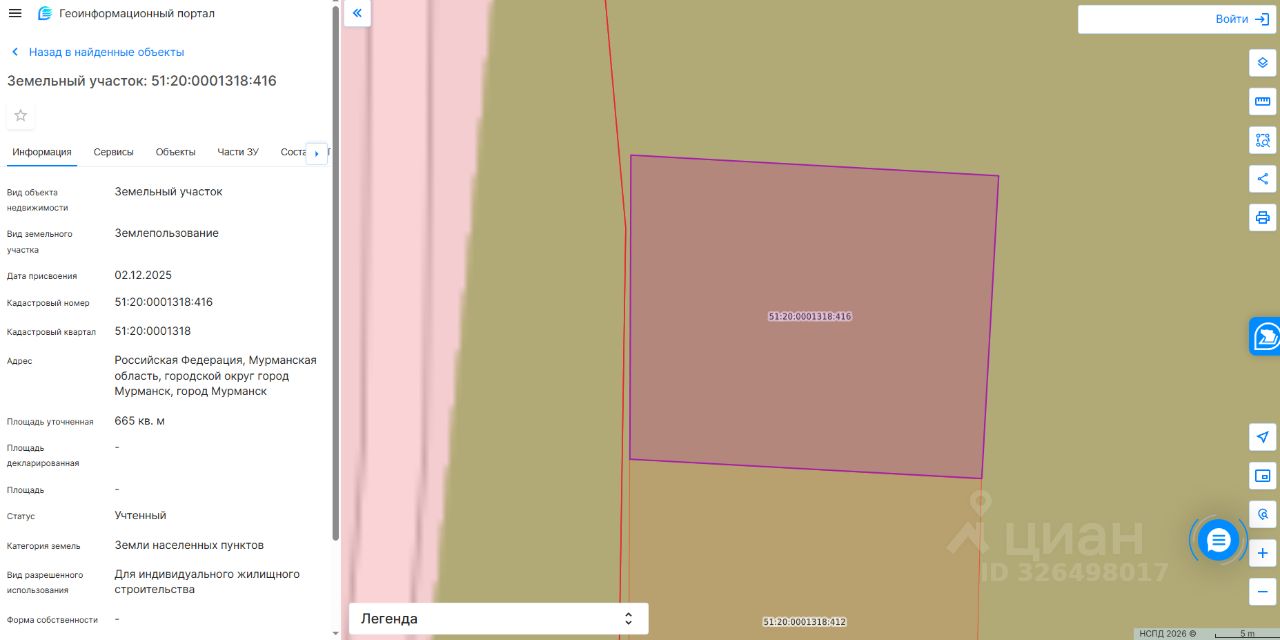 Земельный участок с кадастровым номером 51:20:0001318:416 площадь 665 по адресу Российская Федерация, Мурманская область, городской округ город Мурманск, город Мурманск