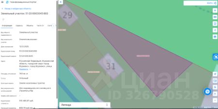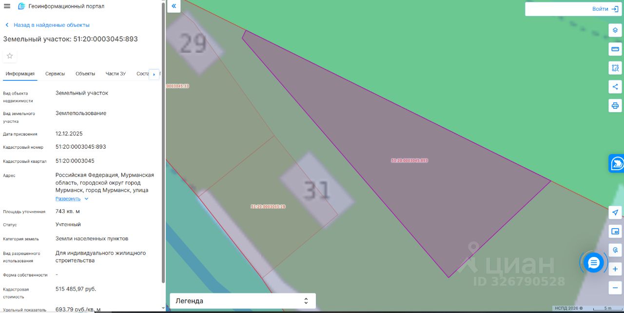 Земельный участок с кадастровым номером 51:20:0003045:893 площадь 743 по адресу Российская Федерация, Мурманская область, городской округ город Мурманск, город Мурманск, улица Боровая