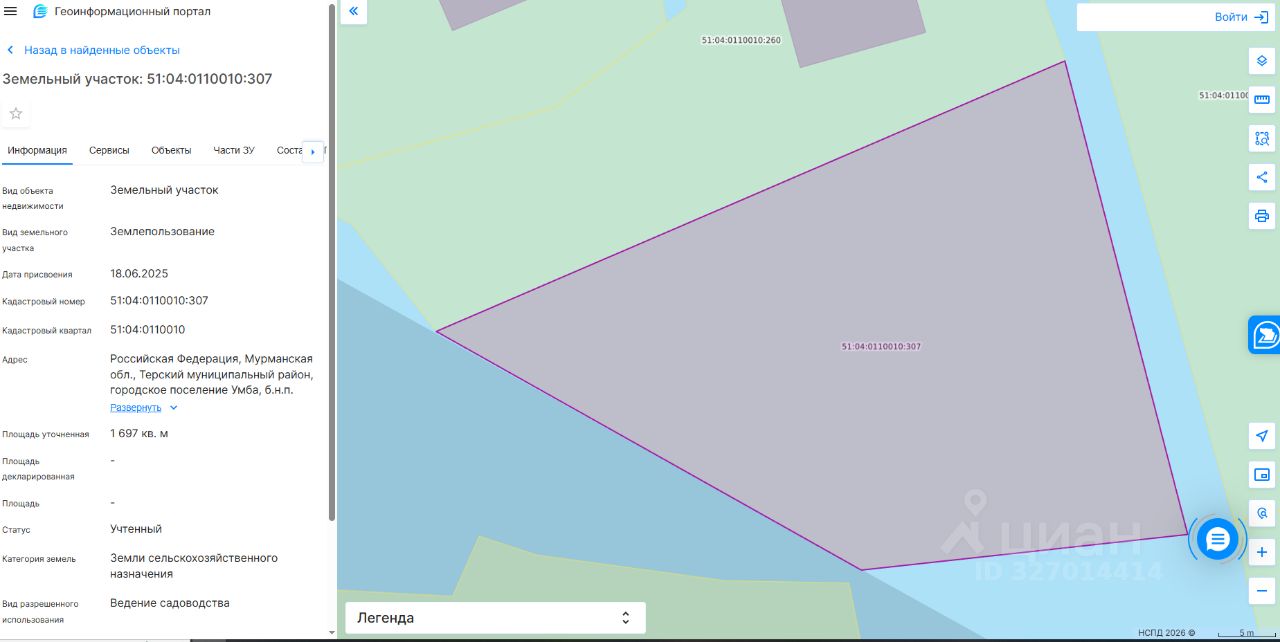 Земельный участок с кадастровым номером 51:04:0110010:307 площадь 1697 по адресу Российская Федерация, Мурманская обл., Терский муниципальный район, городское поселение Умба, б.н.п. Кузрека