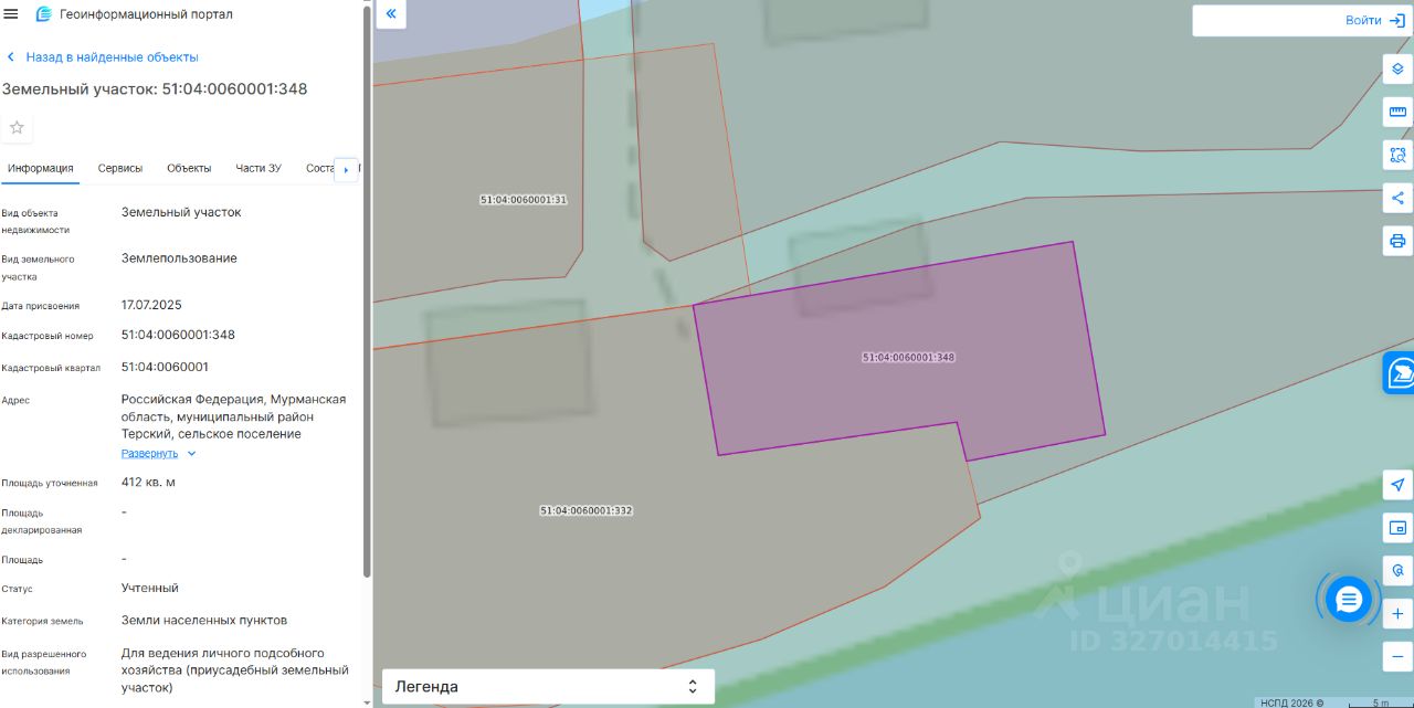Земельный участок с кадастровым номером 51:04:0060001:348 площадь 412 по адресу Российская Федерация, Мурманская область, муниципальный район Терский, сельское поселение Варзуга, село Чаваньга