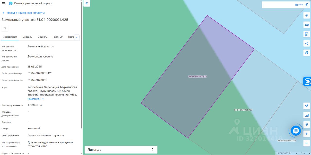 Земельный участок с кадастровым номером 51:04:0020001:425 площадь 1008 по адресу Российская Федерация, Мурманская область, муниципальный район Терский, городское поселение Умба, село Оленица