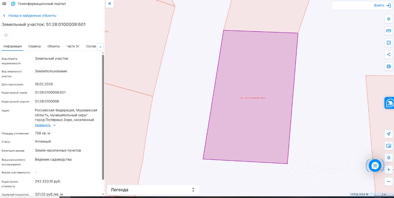Данные получены с сайта ГИС Торги. Земельный участок с кадастровым номером 51:28:0100008:601 площадь 758 по адресу Российская Федерация, Мурманская область, муниципальный округ город Полярные Зори, населенный пункт Зашеек, улица Строительная, земельный участок 8