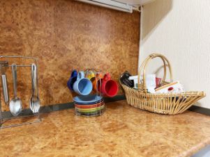 чай, сахар, соль, посуда, вся необходимая техника для приготовления и хранения пищи.
