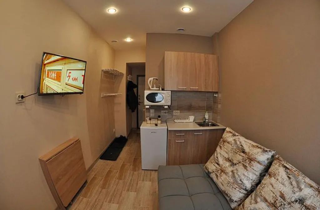 Небольшая и уютная студия с видом на горы недалёко от склона. В студии имеется все необходимое для комфортного проживания 3х человек. Удобный двухспальный диван-кровать, кресло- кровать, раскладная обеденная зона, компактная кухня со всем необходимым, wi-fi, телевизор, стиральная машина, водонагреватель. До ГК "Большой вудьявр" всего 800 метров. В пешей доступности продуктовый магазин, аптека.