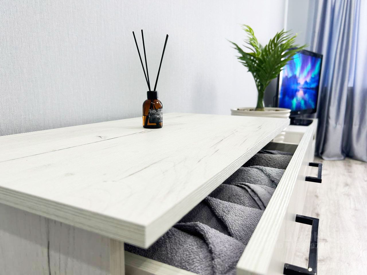 свежее постельное белье, набор полотенец, средства гигиены (туалетная бумага, мыло для рук), телевизор, стиральная машина, утюг, напольная сушилка, гладильная доска.