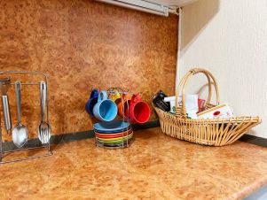 На кухне: чай, сахар, соль, посуда, вся необходимая техника для приготовления и хранения пищи.