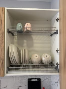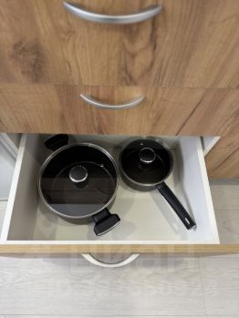 - Кухонный гарнитур с необходимой техникой и аксессуарами (электрический чайник, плита, набор столовых принадлежностей, микроволновая печь, холодильник);