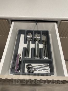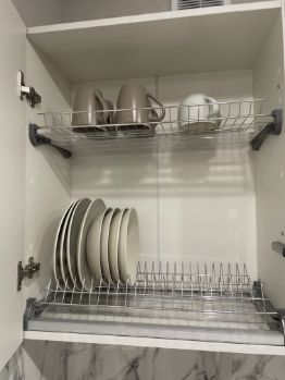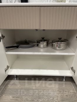 - Кухонный гарнитур с необходимой техникой и аксессуарами (электрический чайник, плита, набор столовых принадлежностей, микроволновая печь, холодильник);