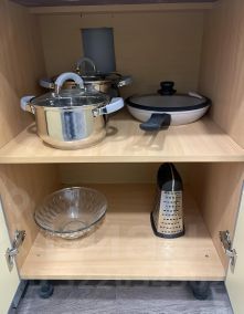 - Кухонный гарнитур с необходимой техникой и аксессуарами (электрический чайник, плита, набор столовых принадлежностей, микроволновая печь, холодильник);