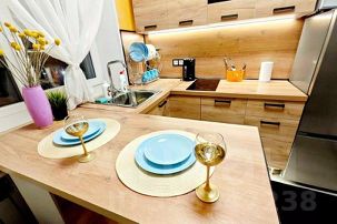 Есть абсолютно все необходимое для комфортного проживания: современный телевизор, микроволновая печь, электрическая плита, чайник, холодильник, необходимая посуда, стиральная машина, водонагреватель, утюг, гладильная доска, фен.