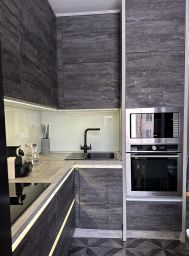 Кухня полностью оборудована для самостоятельного приготовления еды: духовой шкаф, варочная панель, микроволновая печь, чайник, набор посуды и кухонных принадлежностей, а также капсульная кофемашина для ароматного утреннего кофе.