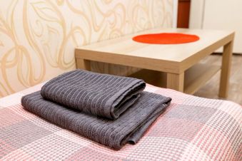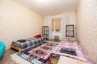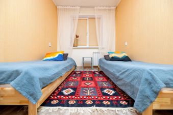 В каждой комнате по две односпальные кровати, при необходимости кровати собираются в двуспальные. Есть стеллажи и комод для хранения одежды.