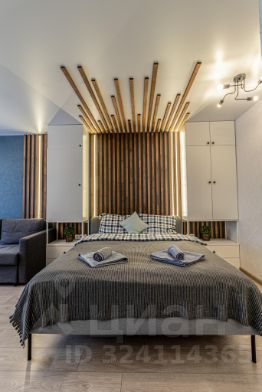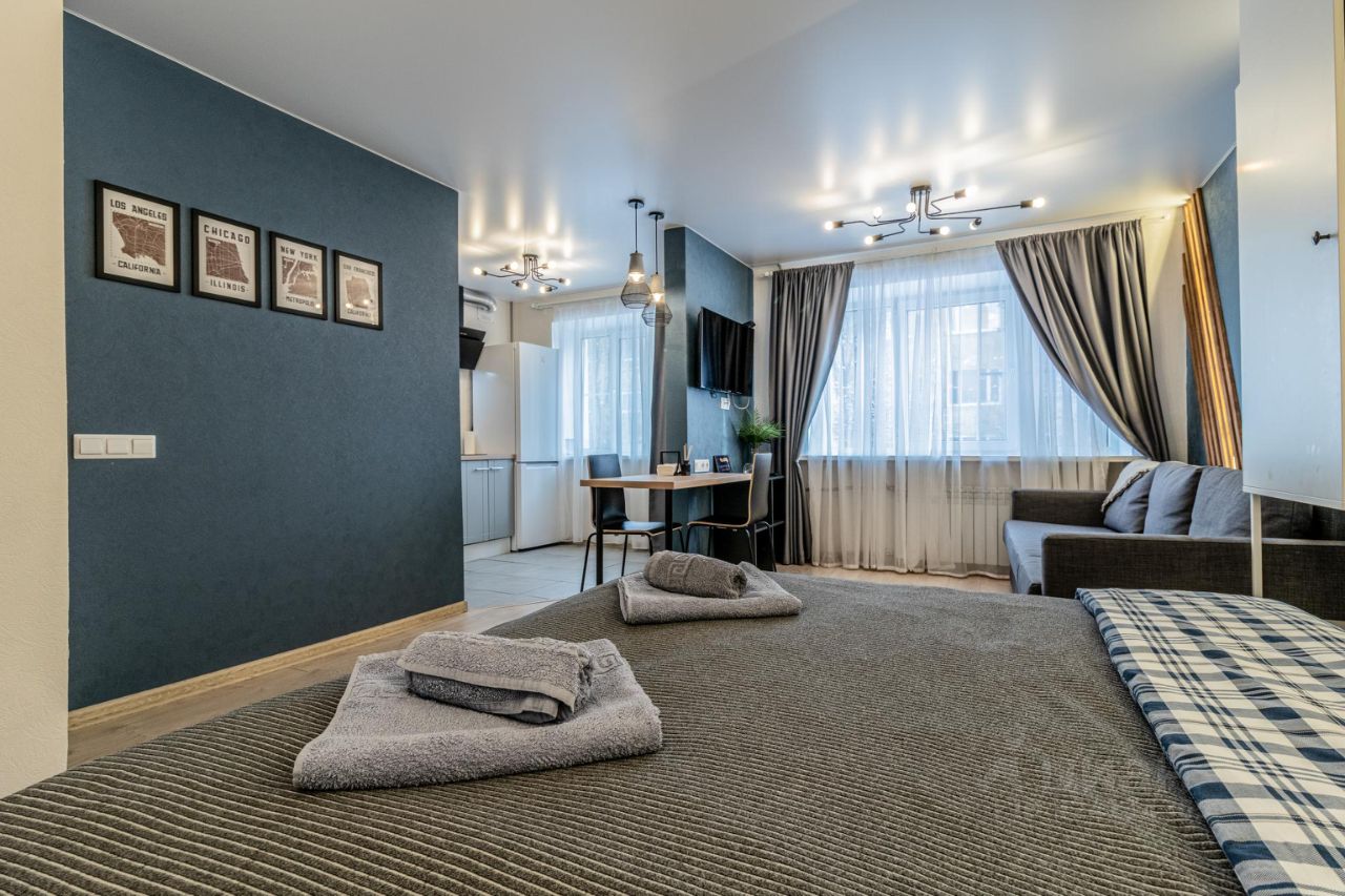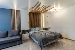 В апартаментах два полноценных спальных места: широкая двуспальная кровать и комфортный раскладной диван, если гости заезжают компанией.