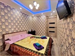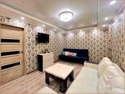 Трехкомнатная квартира в центре города. Спальных мест 8, двуспальная кровать, два двуспальных дивана книжки, угловой двуспальный диван.