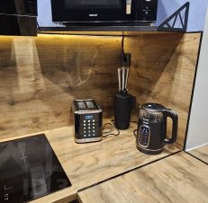 Полностью оборудованная кухня сенсорной бытовой техникой (чайник, тостер, микроволновая печь, духовой шкаф, варочная поверхность, вытяжка, посудомоечная машина, кофемашина + бонус кофе в зернах), посудой и средствами для мытья посуды, проточным фильтром для воды.